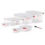Store your food safely and efficiently, with these Araven 1/9 GN food containers (1Ltr). Constructed from durable polypropylene plastic, these containers resist warping and shattering, enabling them to stand up to years of commercial kitchen usage, which saves you money on buying replacements. Featuring a tight-fitting lid, these containers keep your food fresher for longer and safe from bacteria, allowing you to cut down your wastage and ensure your menu is kept fully-stocked. The 1Ltr size of these containers allows for storing a decent amount of items, saving you space and saving you money on buying other containers. There is a permanent wipe clean label fixed to each container, helping you to keep track of foods and quickly identify them during a busy service. The pull tab allows for quick and easy opening, saving you time when you need to access your food quickly. The set of tabs included (red, yellow, green and blue) are also colour coded, allowing you store different types of food pertaining to the colour. These containers are dishwasher safe, allowing you to put them straight in your dishwasher and save time on manual washing. They’re also freezer safe for storing food in the freezer and keeping it clean and organised. These containers are versatile pieces of kitchen equipment from specialist brand Araven.