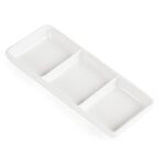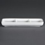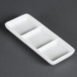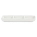 Great value pure white porcelain 2 1/2x 6″ three section display dish for presenting food by Olympia, ideal for snacks and dips.
