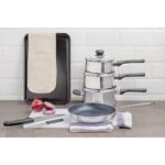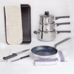 Whether moving into halls of residence, a student house or any other university accommodation, a reliable set of kitchenware is essential, preventing repeat purchases of low quality equipment to avoid wasting your student loan. Luckily, this student accommodation cooking set offers all of the above. Designed to endure the rigours and demands of university life, this student kitchen starter pack will make the perfect addition to your new home, offering tremendous functionality at an affordable price. Featuring three Kitchen Craft saucepans, a Vogue non-stick aluminium frying pan and a Vogue non-stick baking tray, the set gives you incredibly robust, dependable and easy to use cookware, ensuring a long-lasting life while allowing even the most novice of cooks to easily create delicious homemade meals. A high quality Hygiplas white low density chopping board, chef’s knife and serrated tomato knife make preparing fresh and healthy ingredients easy. A blue tea towel and pair of thick oven gloves also gives you the perfect tools for safely removing hot food from the oven, preventing any burns or accidents when cooking.