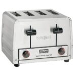 The highly robust, heavy duty Waring Commercial 4 Slice Toaster WCT805K from our exclusive brand Waring features electronic browning controls for each slot side, carriage control lift-out levers and self centring bread racks. Replaceable commercial standard heating elements with auto switch-off and four 28mm slots, which can easily accommodate up to 380 slices per hour, all ensure the toaster can withstand the rigours of high output usage and last a long time. The toast pops up automatically when bread reaches the required level of toasting.