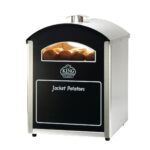 Made from the same high quality materials as the larger King Edward models, the Bake King Mini Oven in stainless steel is able to quickly and easily cook up to 25 jacket potatoes, whilst storing up to 25 more in the storage and display area at the top. Incredibly efficient, the oven uses a simple 13A plug for power, yet still cooks potatoes within 60 minutes. The customer facing side of the oven features a handy menu glass, allowing you to attractively merchandise potatoes or other menu items as required.