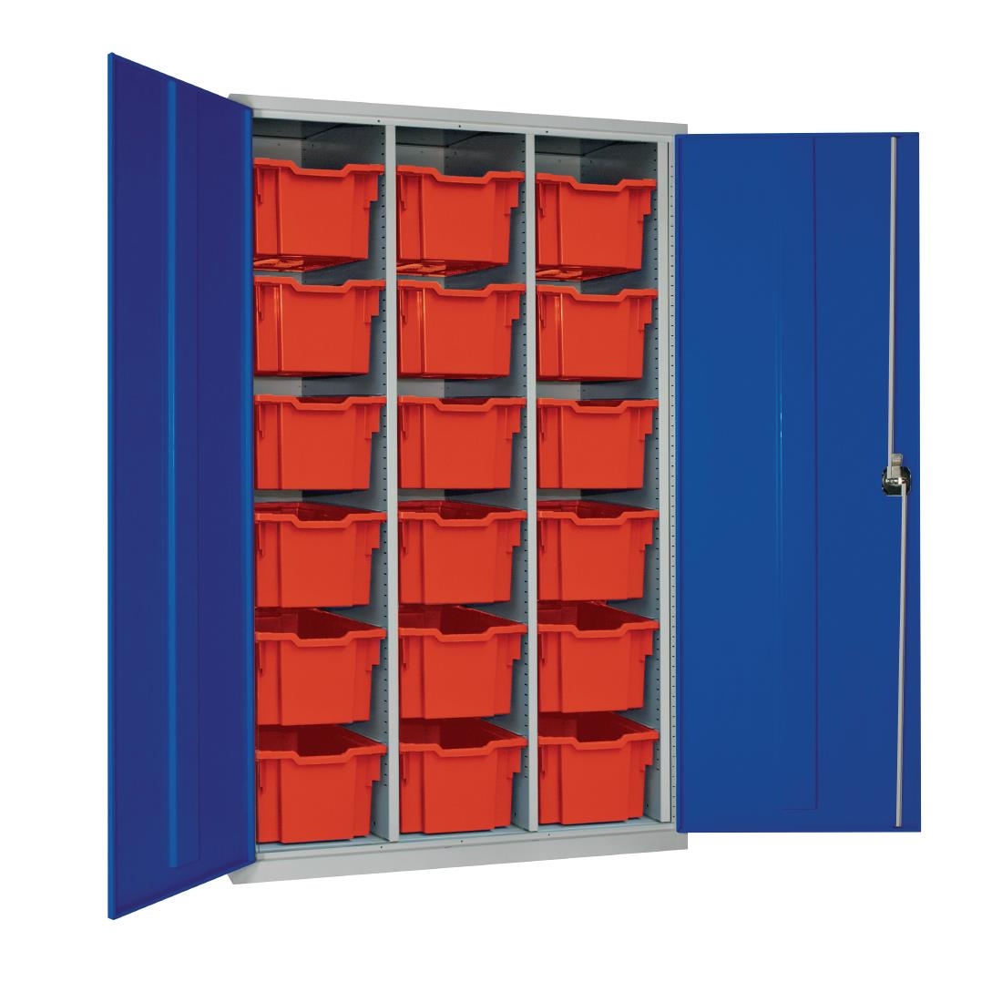 Standing 1830mm tall, the cupboard ensures safe storage with its 3-point locking system. A steel construction with blue powder-coated doors makes it durable, resistant to wear and suitable for diverse settings. This model comes supplied with 18 deep trays (225(H)x312(W)x418(D)mm) in a three-column configuration.