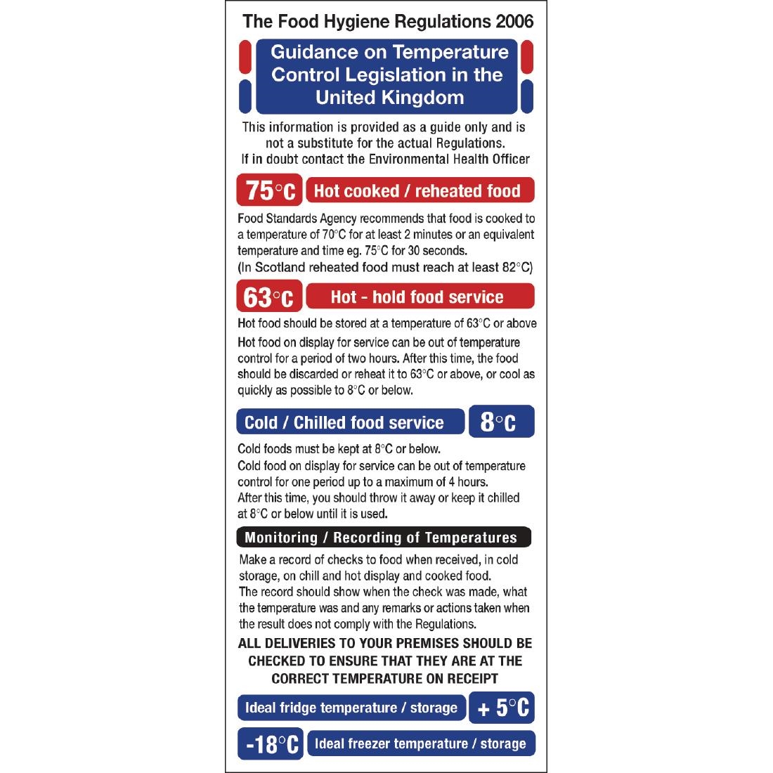 This catering sign highlights the regulations set by the 2006 food act, providing guidance on temperature control, cold or chilled food service and the monitoring of food temperature. Ensure that your staff are aware of this important information by displaying this highly visible sign in kitchens and food preparation areas where it can be easily seen and read by all.