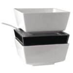 Elegant melamine APS white square bowls with a distinctive base which gives the impression of floating at the edge of the table. Clear edges and smooth surfaces are combined with durability to achieve a timeless and classic appearance.