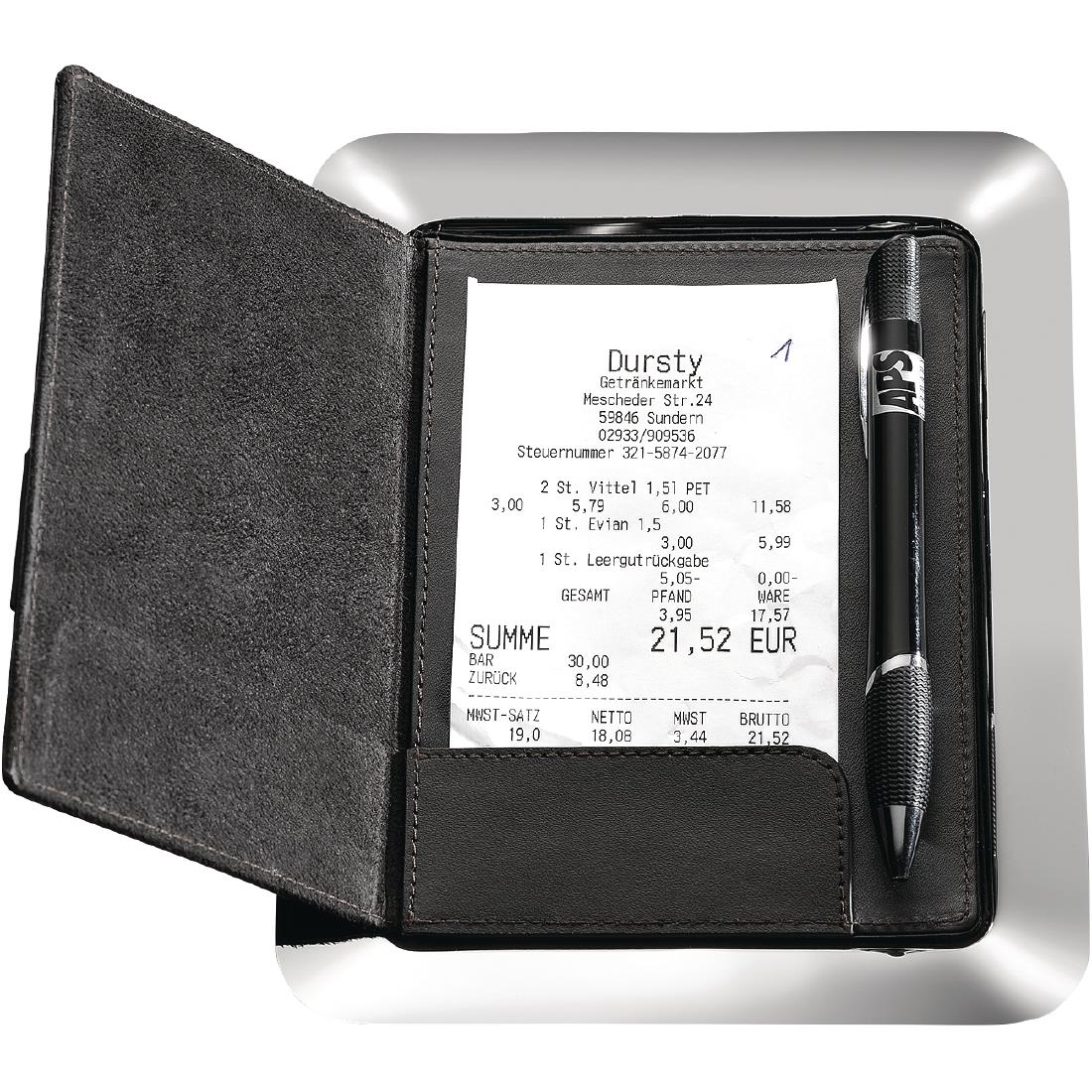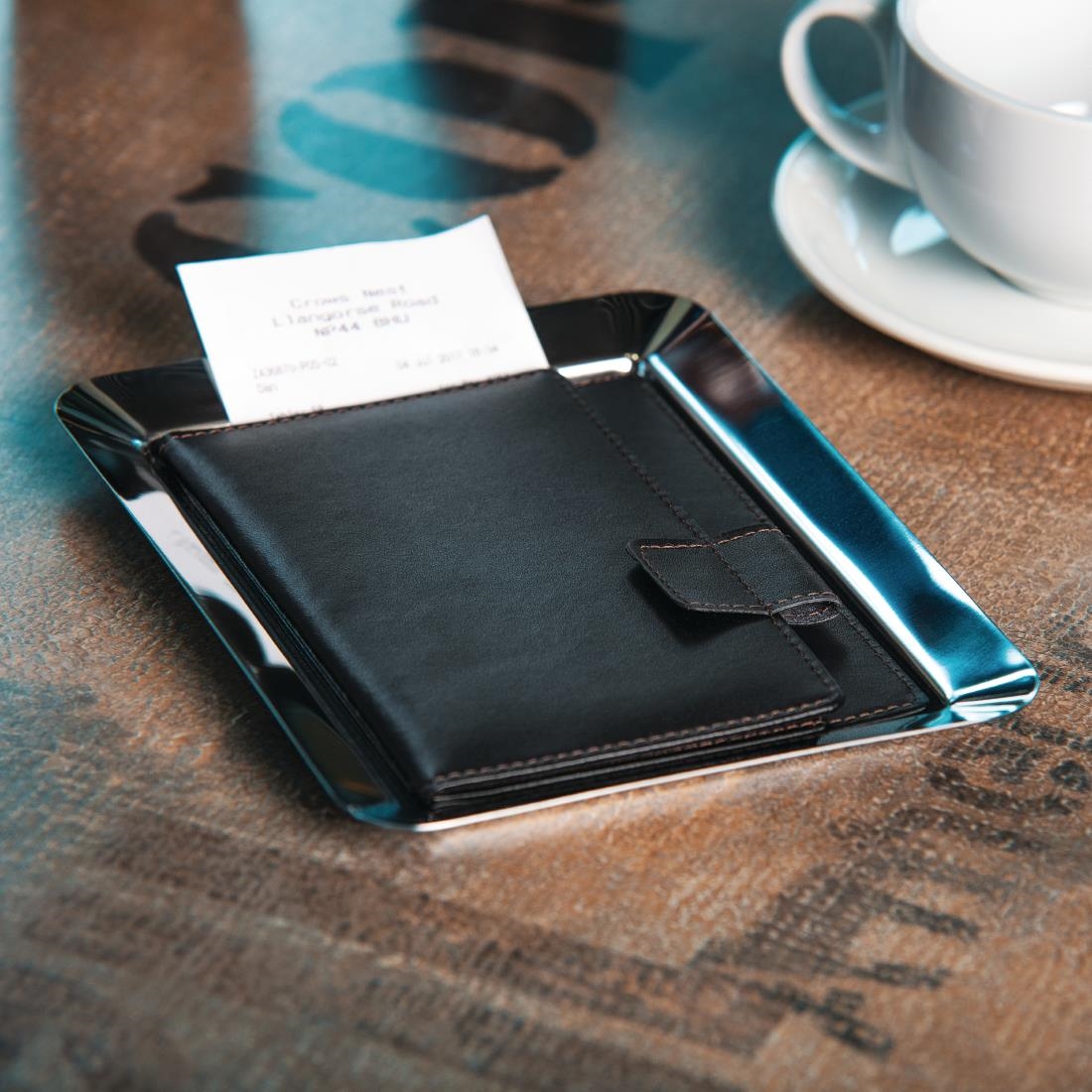 Present bills with discretion, taste and style using this stainless steel backed bill presenter from APS. The real leather bill folder holds the bill and leaves room for a pen, with the inbuilt overhangs designed to hold both the check and your diner’s card. This luxurious bill folder ensures that your customers’ final impression lives up to your restaurant and food, meaning that paying the bill reaffirms the quality of your business.