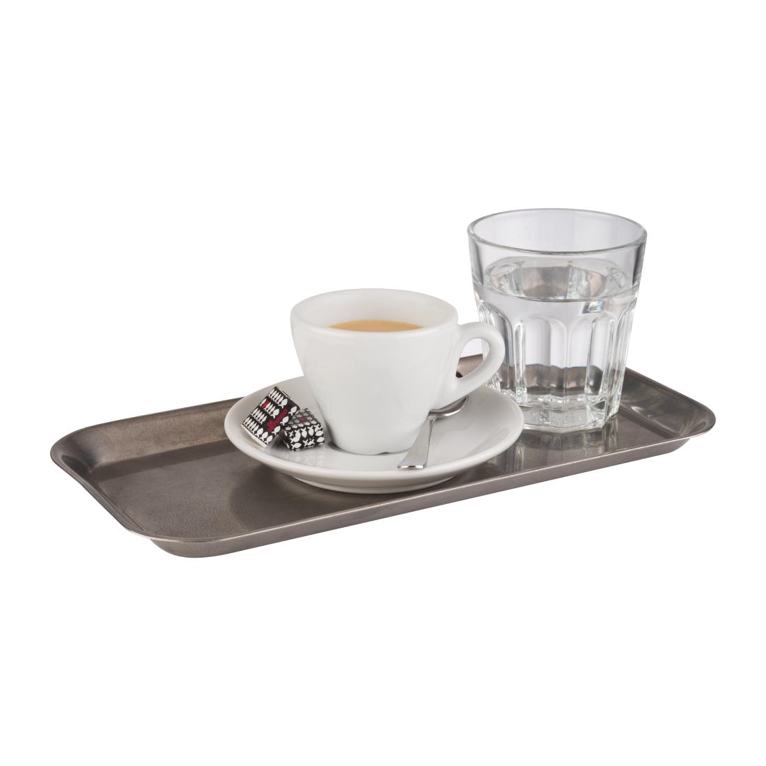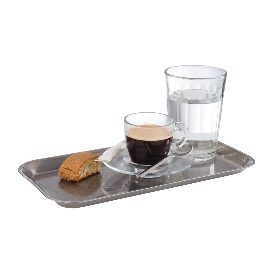 Bring a touch of class to your tea and coffee service with this 260(W) x 135(D)mm APS Vintage stainless steel serving tray. The tray’s antique-effect finish gives it a wonderfully classic, vintage look that’s sure to add a luxurious touch to your food and drink presentation. The sturdy stainless steel construction also stops this tray from flexing when carrying heavy loads – reducing the risk of drops or spills when serving.This stainless steel build means the tray is dishwasher-safe too, so cleaning is always easy.