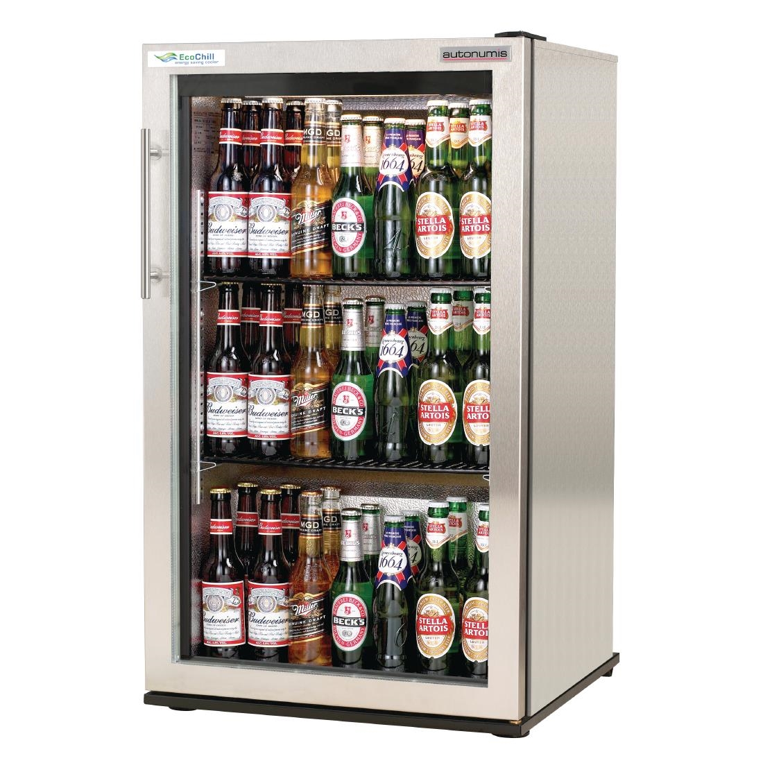 The high quality Autonumis EcoChill single door back bar bottle cooler in stainless steel is an efficient yet powerful beer fridge able to chill large quantities of bottles quickly whilst using around 30% less energy than equivalent standard models. The fully adjustable shelving and efficient LED lighting allows you to attractively merchandise beers, ciders and soft drinks perfectly, whilst the foam insulated exterior and high efficiency compressor ensures that bottles are chilled quickly and remain cool, even when the doors are opened regularly. Useable capacity 110 litres.