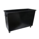 A durable plastic bottle skip with easy-grip handles on both ends and 4 omnidirectional castor wheels.