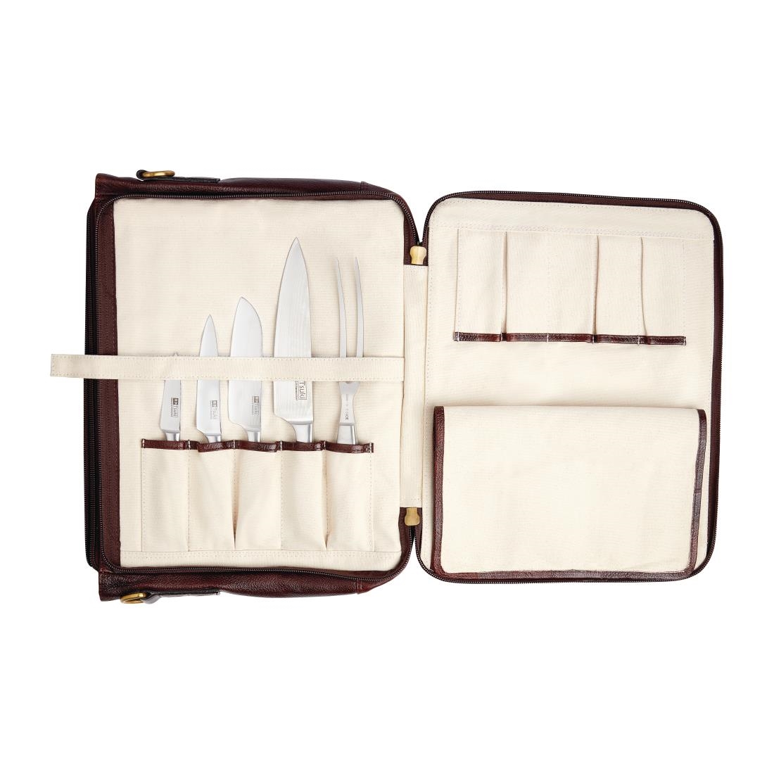 A feature, beautiful brass buckles with 10 slots for knives and keeps everything in place on the go
