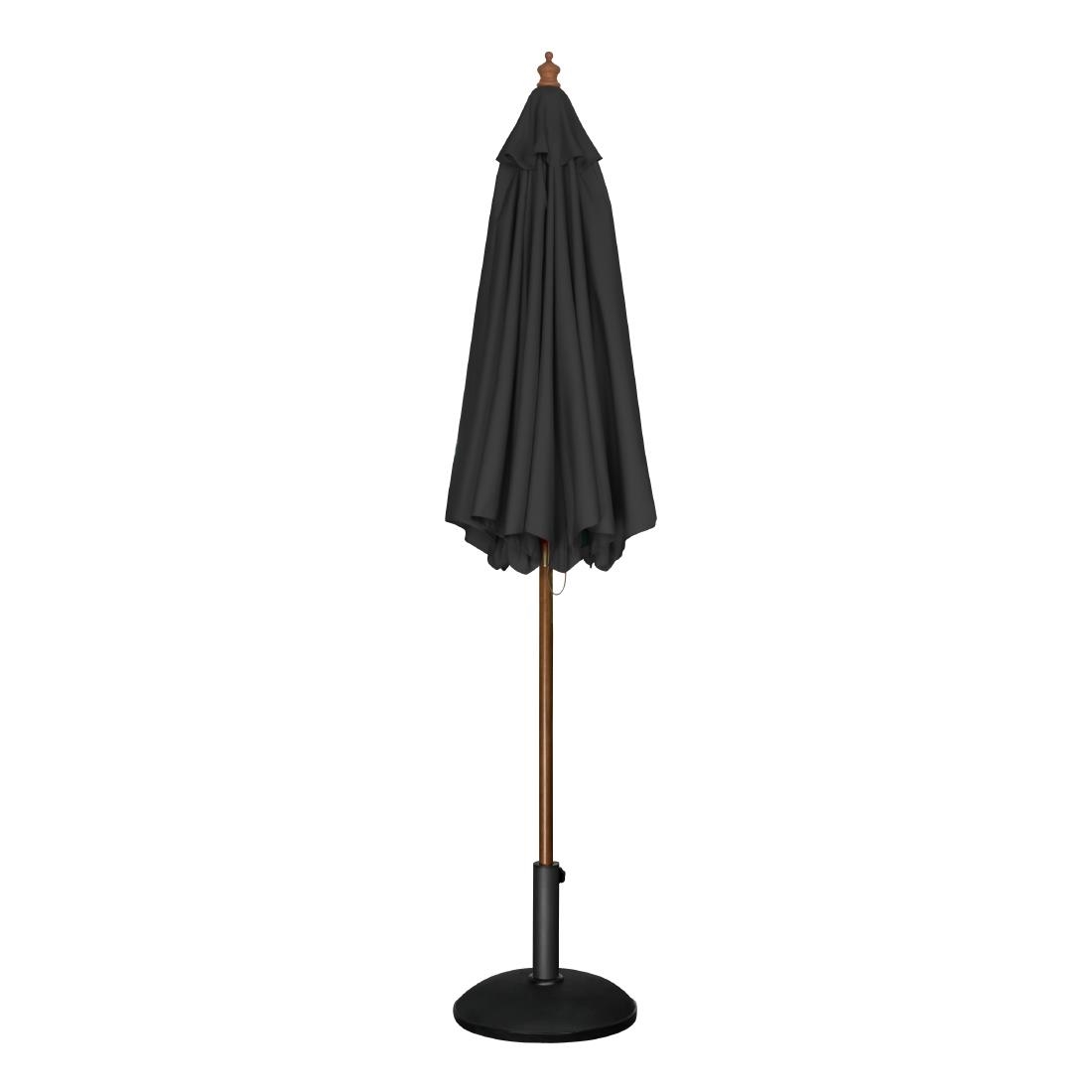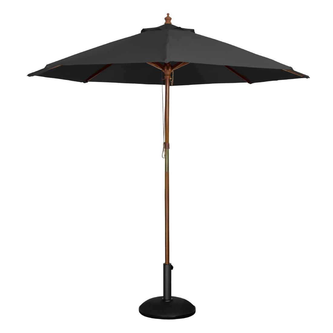 Offer guests protection from the great outdoors, with this 3(Ø)m black parasol from Bolero. The parasol is crafted with a 245gsm, water-repellent polyester canopy that provides effective protection against the elements – from intense sunshine, to heavy downpours. This allows visitors to comfortably make the most of your outdoor area in all weather conditions.The bold and elegant black colourway, paired with a wooden mast is sure to enhance the look of any patio, beer garden or seating area – providing an extra, stylish touch. Designed with an ergonomic pulley system, the parasol is easy to set up to put away when required. This means that staff can quickly improve your outdoor areas with minimal effort.Please note that bases are sold separately.