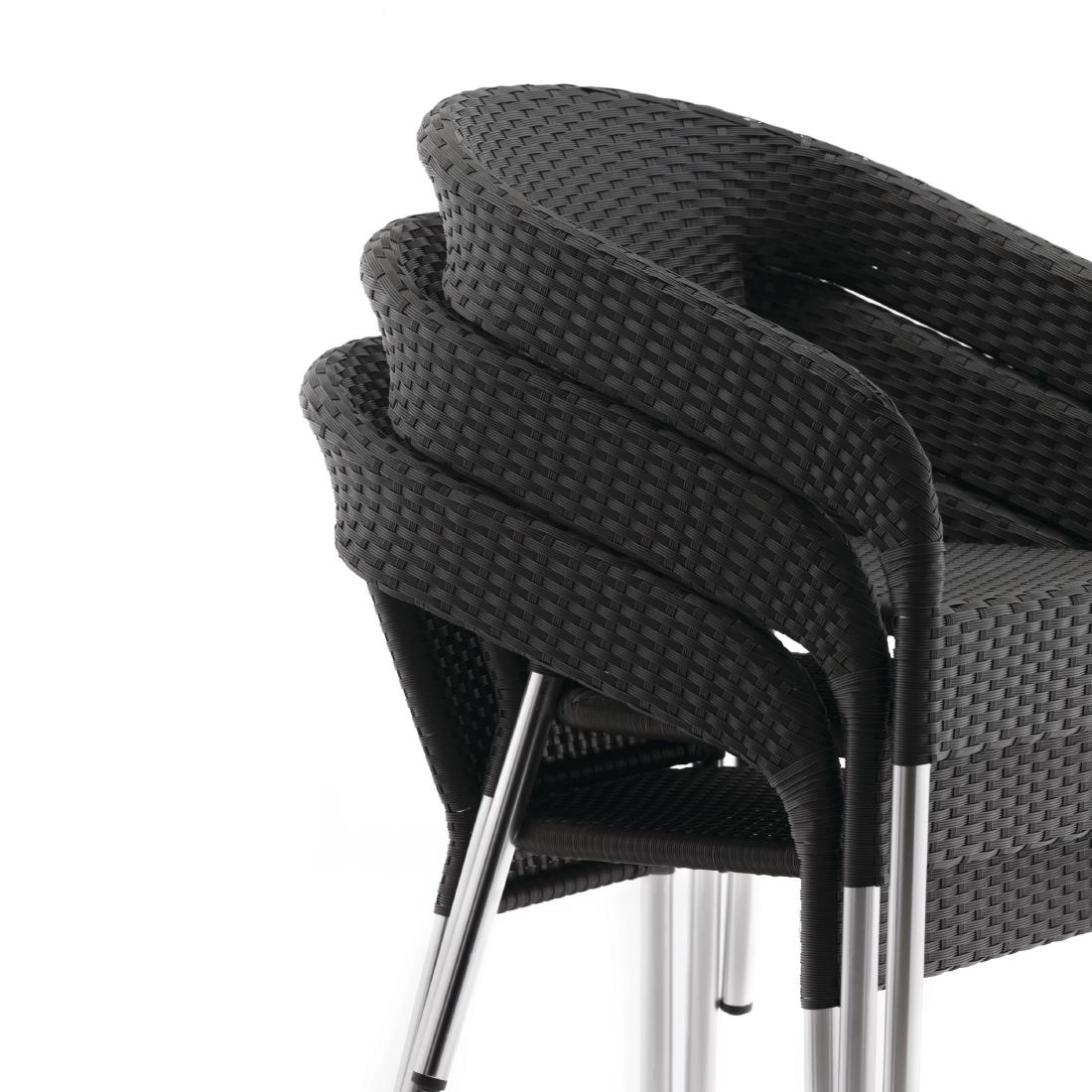 Give your furniture a well-deserved upgrade, with the pack of 4 wraparound bistro chairs from Bolero. With a bold and sophisticated black colourway, these chairs add an inviting touch to your indoor or outdoor seating areas – enticing guests to enjoy your services time after time. These stylish wraparound chairs are highly durable, resistant to light weathering and easy to wipe clean thanks to the polyethylene wicker construction. This makes them ideal for regular use outside in pavement or patio areas – giving you long-lasting furniture that doesn’t sacrifice comfort. The stackable design means that the chairs can be stacked up to 10-high, which not only helps during packing-away at the end of service, but saves you vital storage space.
