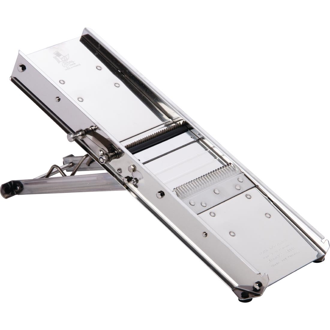 Make your food preparation more efficient with this high quality mandoline from Bron. Crafted from hardwearing stainless steel, the utensil is able to cut high volumes of vegetables with speed and precision to improve your preparation times. Supplied with a rotary blade, which produces julienne cuts (3mm wide), and French fries (10mm wide), the mandoline guarantees consistent results every time for impeccable presentation. The durable and robust stainless steel construction is also designed for prolonged and extensive use, helping you keep the mandoline in excellent working condition for longer. It also can also produce straight cuts using the flade blade, or criss cross using the fluted blade. Safety guard sold separately.