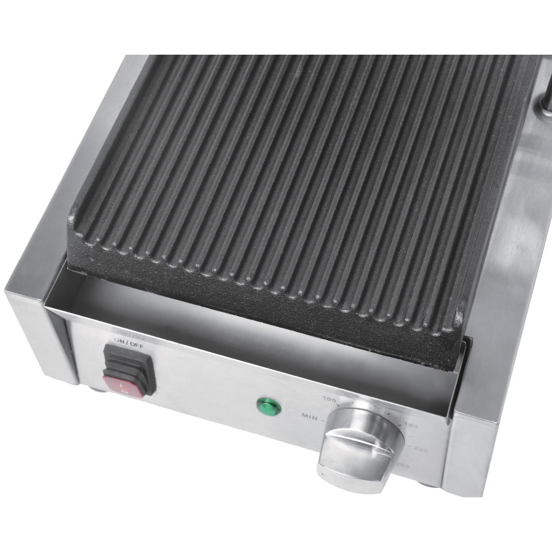 Power: 1.5kW. Single grill. Ribbed upper & lower plates