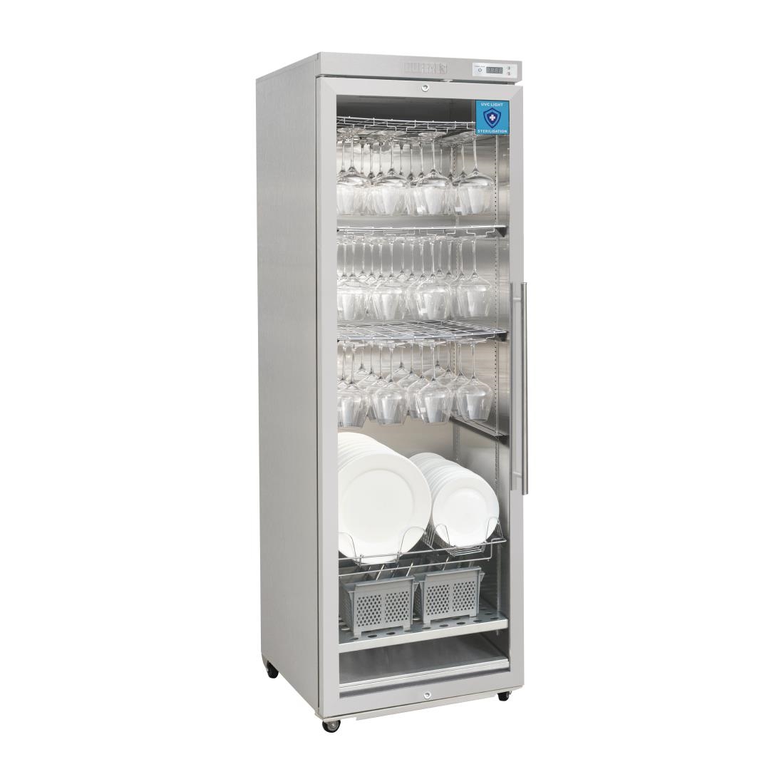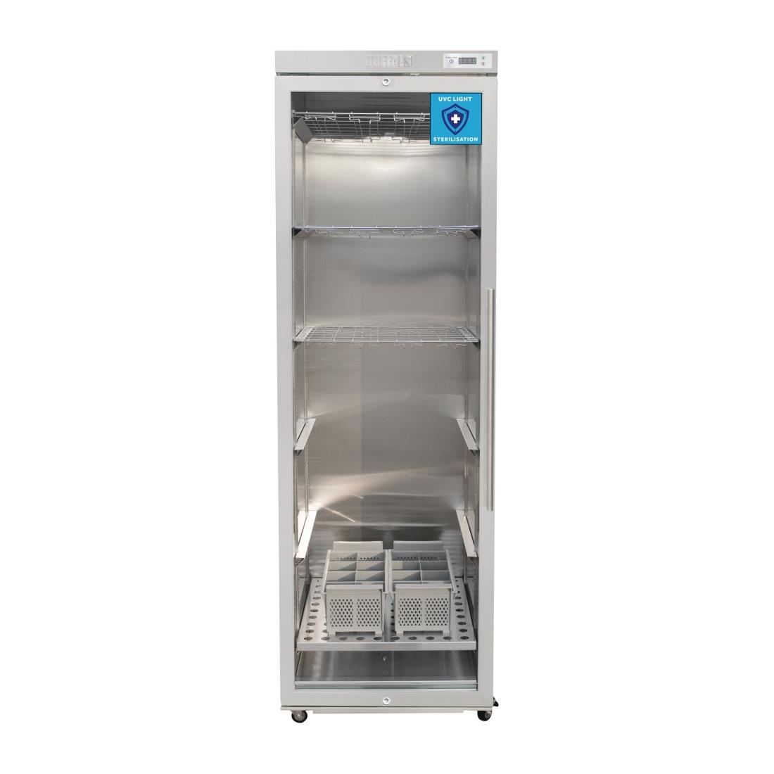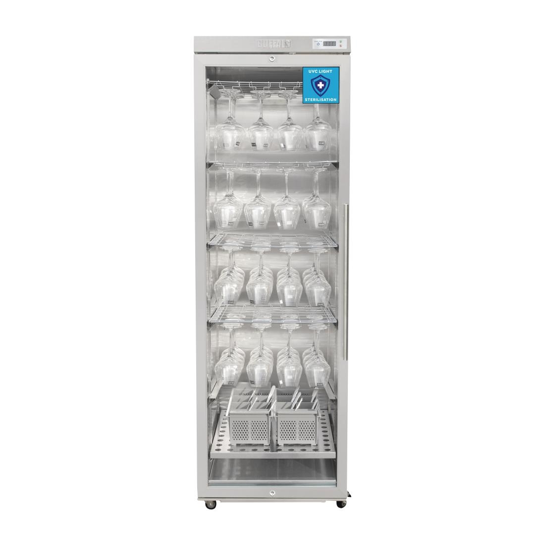 Cleanliness and hygiene has perhaps never been more important than it is today. It’s also never been easier to take action, thanks to the Buffalo UVC Steriliser Cabinet – a fantastic solution for letting your customers and guests know that you’re serious about sanitising glassware, crockery, cutlery, HHTs, mobile phones and utensils.By exposing the contents to UVC light, the cabinet leaves no surface untreated. The germicidal light focused at a specific 254nm wavelength ensures microorganisms are quickly and effectively destroyed, with no need for harsh chemicals, water or high temperatures. And as there’s no chemicals or high temperatures, the cabinet is much more eco-friendly than other solutions which use these methods.The UVC cabinet is exceptionally simple to use – that’s why this type of proven technology has been used in medical facilities for years. Simply load the items inside using the included glass racks or cutlery baskets if required. Then just close the door and set the timer – it’s that easy. Once the cycle is complete, the steriliser displays a green light, showing that the items are ready to use again immediately – there’s no drying or cooling period required.This stylish freestanding steriliser is designed for everyday professional use and is perfect for installing in customer facing areas.