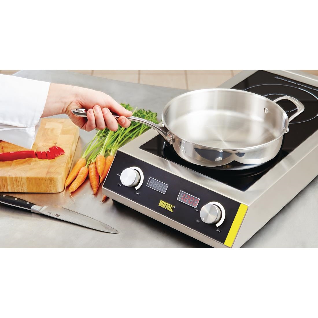 Highly powerful yet efficient, the Buffalo heavy duty double induction hob is a reliable commercial option for the professional kitchen. Delivering up to 7kW of cooking performance over two independently controlled zones, the hob is ideal for restaurants, gastro pubs and anywhere else reliability and energy efficiency is needed. The sturdy stay-cool hob surface is large yet space-saving, able to accommodate pans up to 280mm wide. Easy to use, clean and maintain.Please note: this is hardwired only. The machine is NOT supplied with a plug and requires professional installation by an electrician.