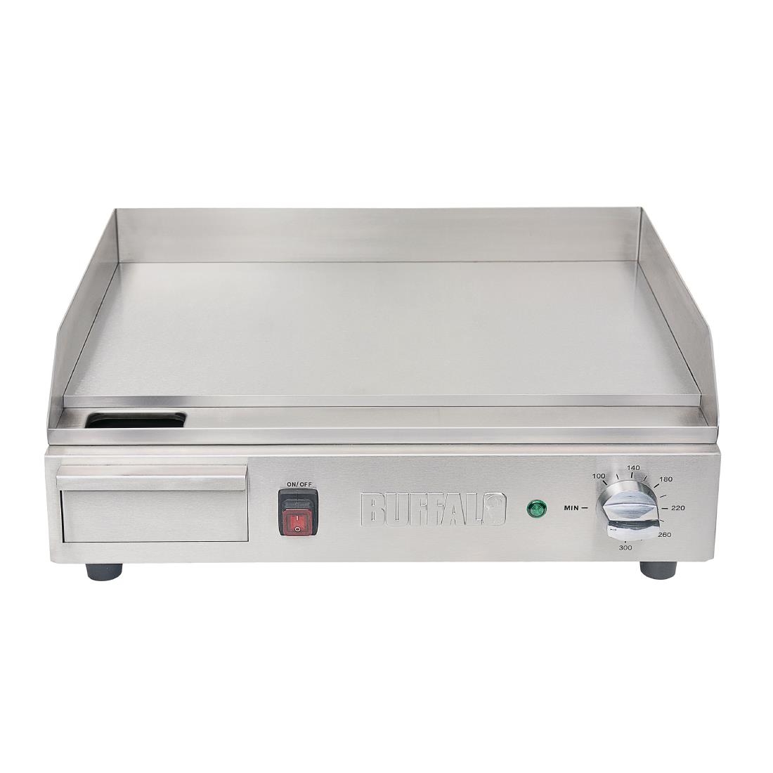Powerful and reliable, the Buffalo commercial griddle features a generously sized steel cooking surface perfect for breakfast, lunch or dinner services. The heavy duty element ensures a rapid heat up and an even spread of heat across the wide griddle surface. With simple dial thermostat control and removable fat collection drawer, the griddle is incredibly easy to use, clean and maintain.
