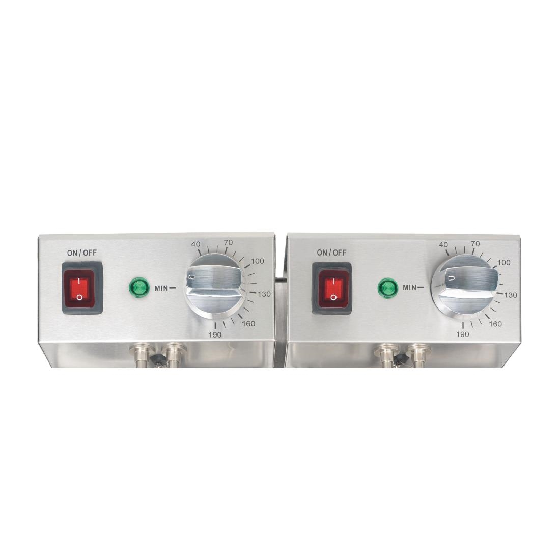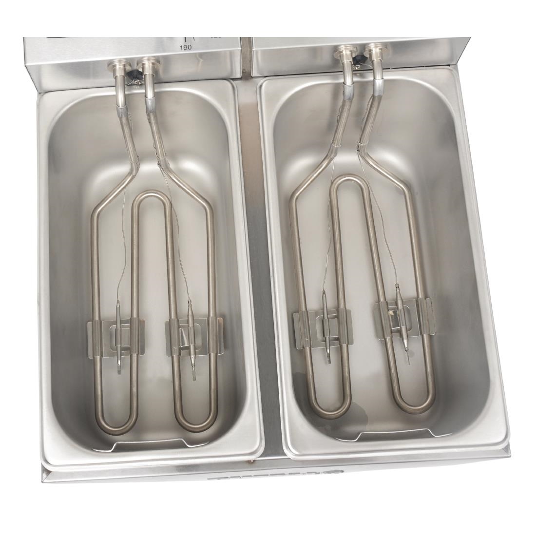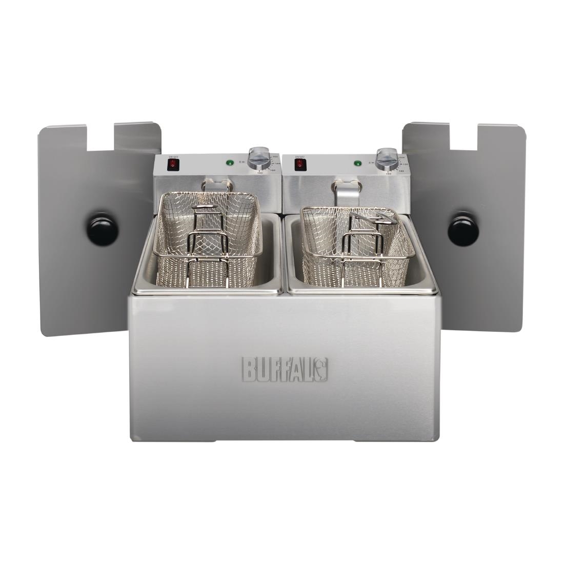 Whether you’re frying fish, chips, chicken or doughnuts, the Buffalo countertop fryer is an excellent choice for smaller scale cooking. With twin independently controlled tanks and two strong frying baskets, the Buffalo makes it easy to cook whatever you need with the minimum of fuss. During quieter hours, you can operate just a single tank to reduce running costs. A superb option for adding flexibility to your kitchen.Please note: each tank has a separate power lead. Uses 2 x 8.7A plugs