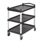 Make transport within the kitchen a dawdle, with the durable and convenient Cambro Three Shelf Utility Cart.Easily transport refuse bins, serving plates and platters, and room service trays with this Cambro BC340KD110 black utility cart. Perfect for hauling bus tubs, food pans, plates, flatware, dry ingredients, and more, this reliable utility cart moves essential items from one room to the next with incredible ease. A durable construction including aluminium uprights and sturdy shelves ensures long-lasting use. With a smooth rolling design that anyone can use, this cart is ideal for any crowded restaurant, cafeteria, or catering event.Is this cart stable?The aluminium uprights of the Cambro Three Shelf Utility Cart ensure stability during usage. The lightly-textured polypropylene and marine rails of the cart also keep the contents in place, ensuring minimum spillage during movement.Is it reliable?Polypropylene is an incredibly durable and reliable material, able to withstand many different stresses. This is essential in professional catering environments, where many knocks and bumps can occur over time.Is the Cambro Three Shelf Utility Cart delivered fully assembled?This utility shelf is delivered unassembled, which minimises shipping costs and saves money for professional catering services. Despite this, the utility shelf is very easy to assemble, saving time spent during assembly.