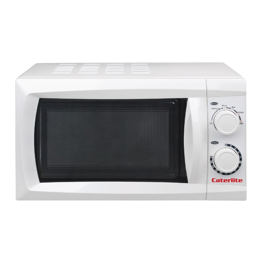 The Caterlite Compact Microwave Oven provides a high-powered and convenient food heating option for professional kitchens.Cook, reheat or defrost food quickly and easily with the compact Caterlite 700W microwave oven. With simple manual dial controls, you can easily select one of six power settings and time up to 30 minutes. The rotating glass turntable ensures a consistent cook throughout the food and once you’ve finished, the stylish white steel interior and exterior is effortless to clean.