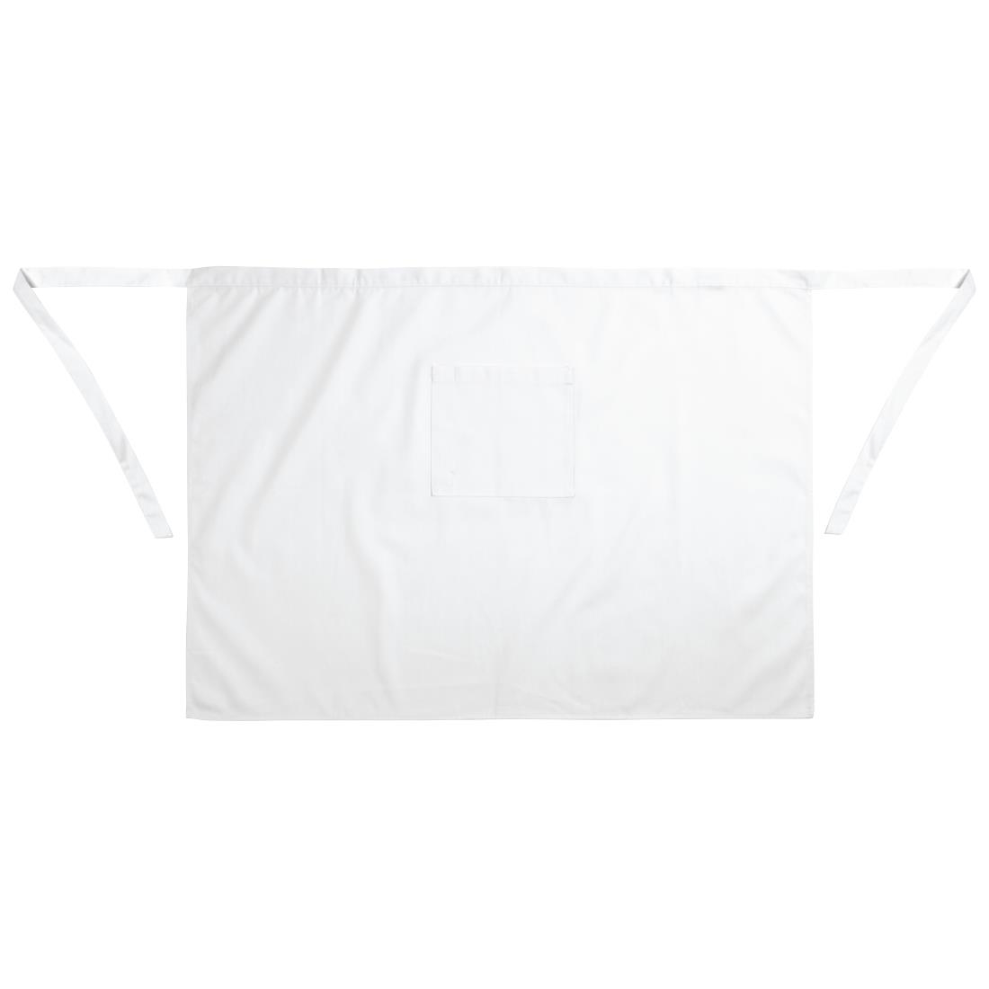 Durable and stylish high quality polycotton regular bistro waist apron in white, perfect for waiters and waitresses, featuring a user friendly patch pocket on the front.