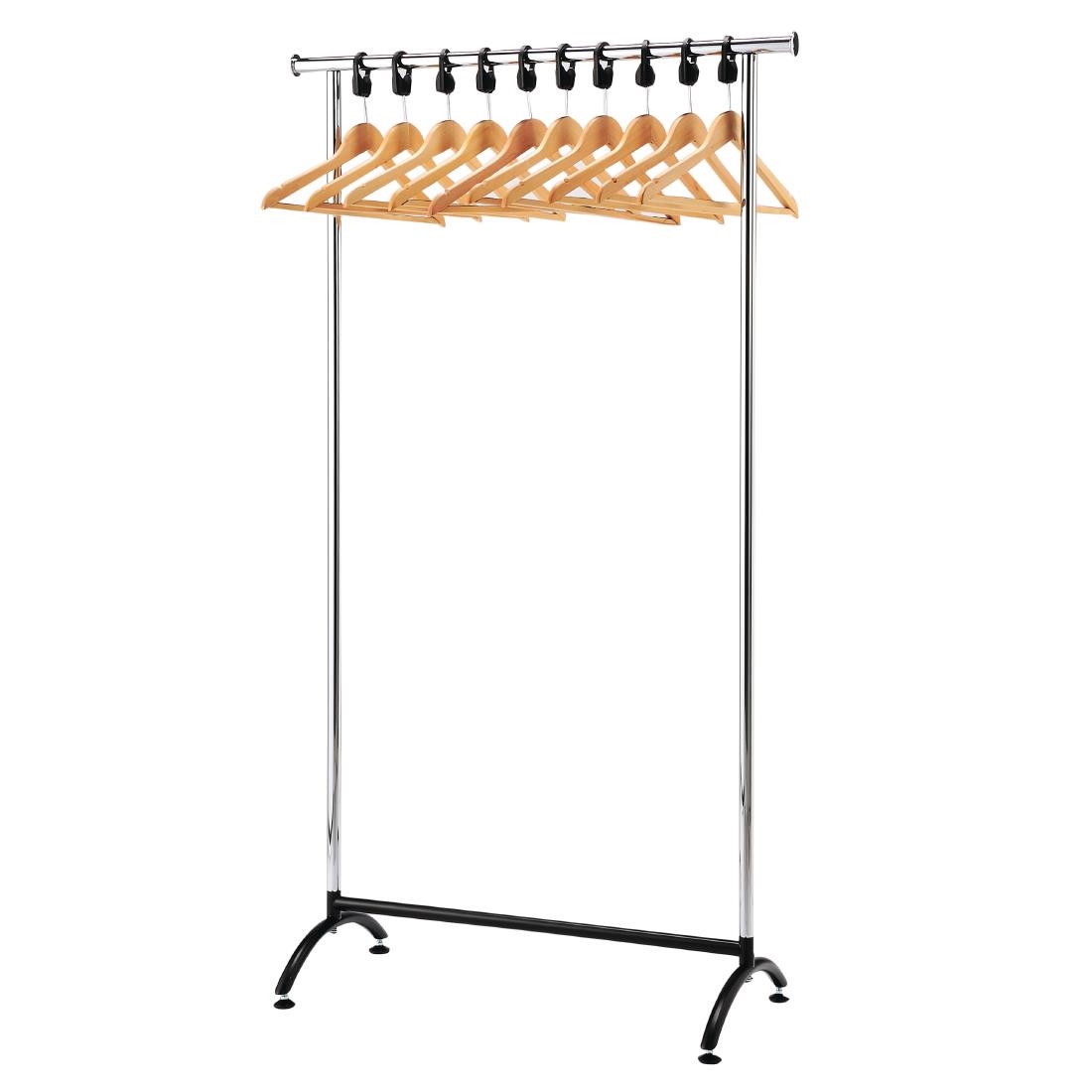 The chrome coat rack with 10 wood hangers is designed for use with standard hook hangers as well as security collar hangers, making it perfect for use in private and public areas. Complete with 10 wooden hangers, the chrome coat rack can be used in reception areas as well as seminar halls and meeting rooms.