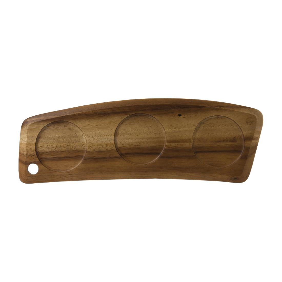 With a rustic, yet contemporary design, this pack of 4 large deli boards from Churchill add a special touch to any front of house. The boards are ideal for cuisines that require serving a variety of food, such as tapas or build-your-own style dishes, due to the three, dimpled serving areas that securely house any bowl, plate or serving dish.These serving boards are made from acacia wood, then is highly durable and easy to clean after use – saving you money on replacements and time on cleaning. This wooden material is complemented by a food-safe lacquer that ensures maximum hygienic and safety for your guests. Features an ergonomic food handle that allows for easy clearing of your dining tables after service.