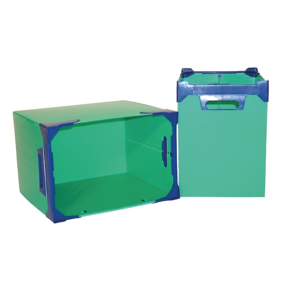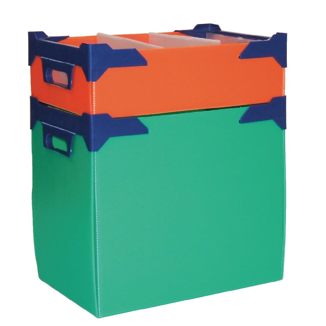 Reinforced corners which allow the boxes to be stacked in use, saving valuable space