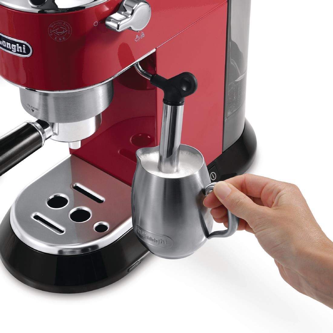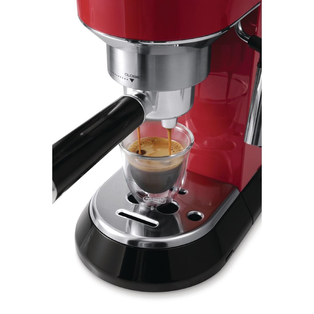 Introducing the DeLonghi Dedica Pump Espresso Coffee Maker, with its slim, professional, eye-catching red design and versatile functionality. At only 150mm wide, the EC685.R is compact enough for the smallest of home kitchens, whilst still offering perfectly made espresso using either ground coffee or ESE pods. Effortlessly perfect coffee in minutes thanks to its Thermoblock heating system and cup warmer, whilst the manual milk frother ensures milk is perfect for cappuccino. Ideal for home use.