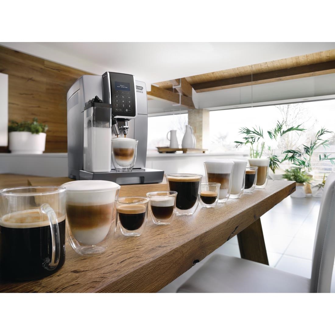The DeLonghi Dinamica Bean-To-Cup Coffee Machine ECAM350.75.S delivers exceptional quality coffee at the touch of a button. Whether you prefer espresso, cappuccino, latte or flat white, the Dinamica can create your coffee to your exact preference and save the settings for the next time. Using the built-in conical grinder, all the flavour and aroma in the beans is used to make your coffee, whilst the dual heating systems ensure coffee and milk is served at the perfect temperature according to your specifications. The integrated cleaning function ensures easy and secure cleaning of all components.