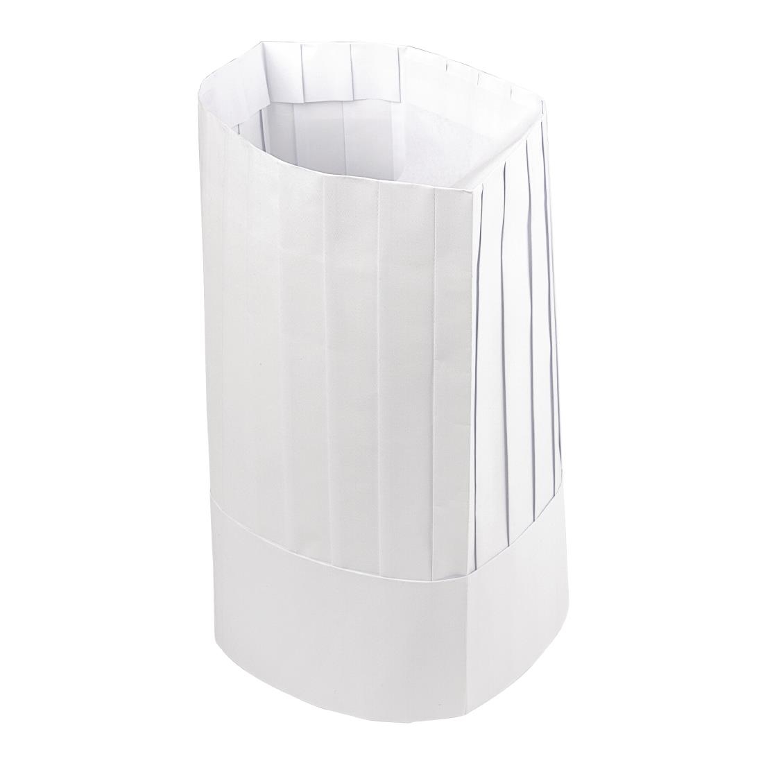 Toque chefs hats made out of paper, these come in packs of 50 and can be disposed off. They are flat packed, and only come in one size.