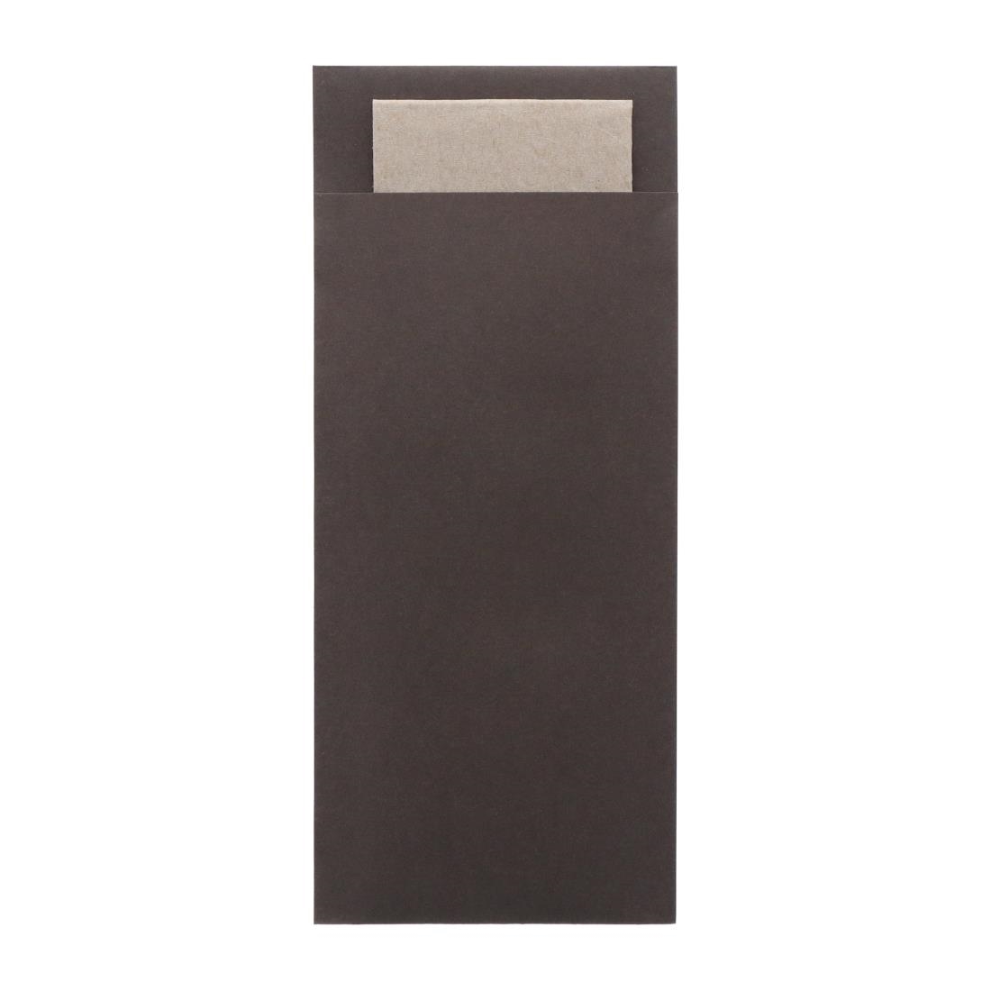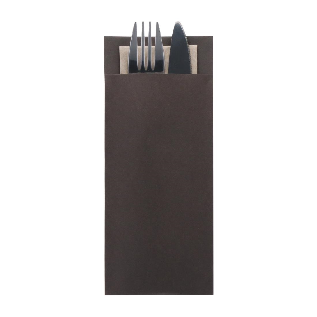 The dark chocolate brown colourway of the pouches, paired with the 2-ply kraft-coloured napkin, adds a unique and sophisticated touch to any dining room, enhancing the overall table setting.