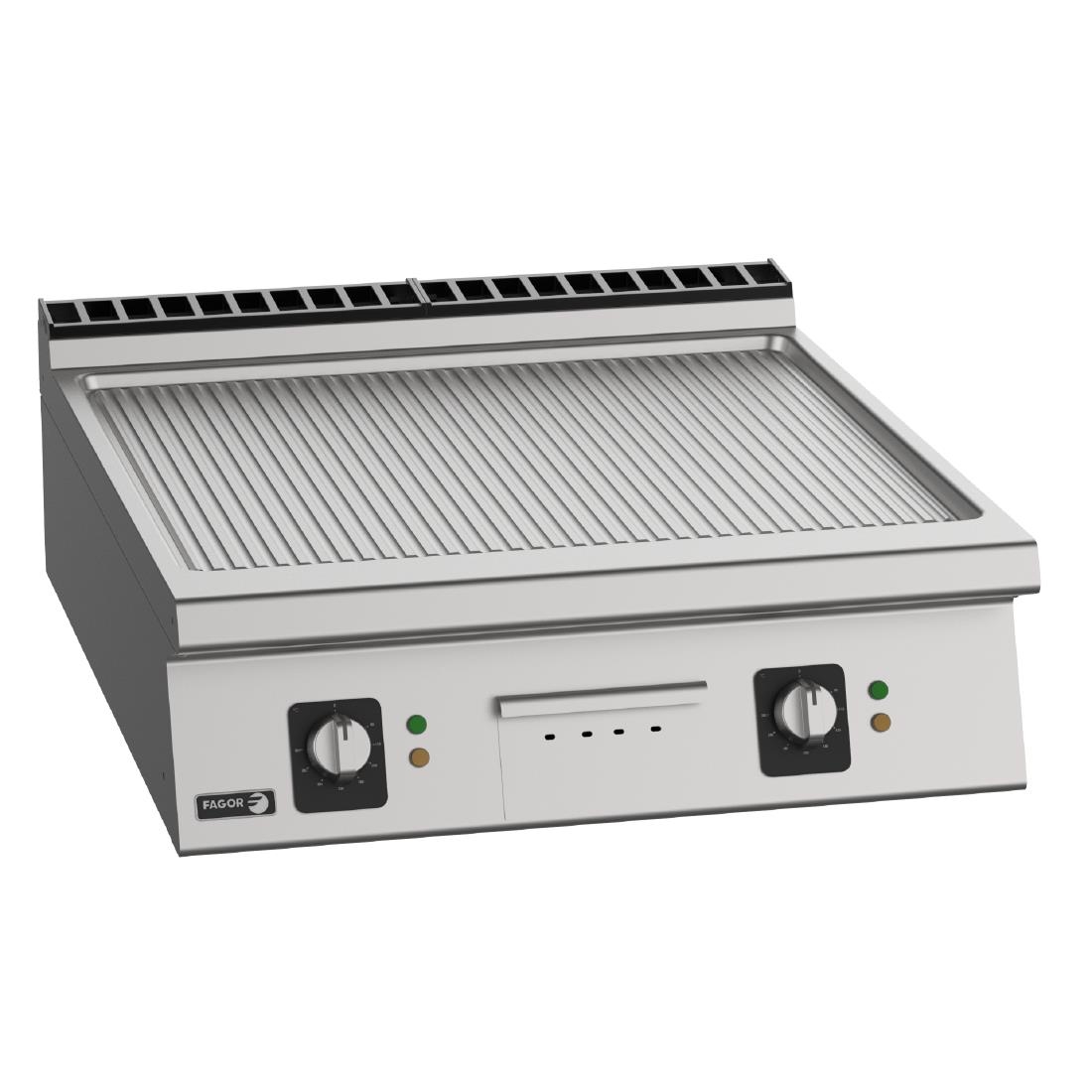Powerful and reliable, the FT-E910 LR Fagor 900 Series countertop half ribbed plate electric griddle provides the perfect cooking surface for busy professional kitchens. Providing an impressive 15kW of power across its 800mm wide, 20mm thick mild steel half ribbed cooking plate, you get a fast heat-up and rapid recovery times – essential for those busy lunch or dinner hours.