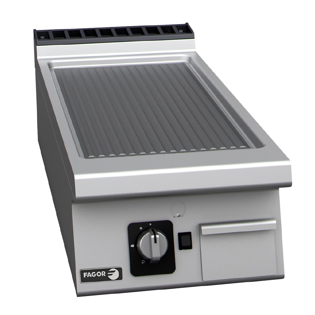 Powerful and reliable, the FT-G905 R Fagor 900 Series countertop ribbed plate gas griddle provides the perfect cooking surface for busy professional kitchens. Providing an impressive 9.25kW of power across its 400mm wide, 20mm thick mild steel ribbed cooking plate, you get a fast heat-up and rapid recovery times – essential for those busy lunch or dinner hours.