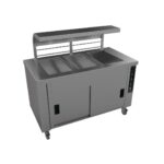 Featuring three separate full size GN compatible wells, the HS3 Falcon Chieftain heated servery counter is designed for the most demanding of professional catering environments such as prisons, hospitals and schools. The top wells provide dry heat and are protected from cross-contamination by the supplied separating panels, whilst the hot cupboard itself provides ample storage for either plated meals or plates. The heavy duty overhead gantry is robust and features grid protected quartz lamps as standard.