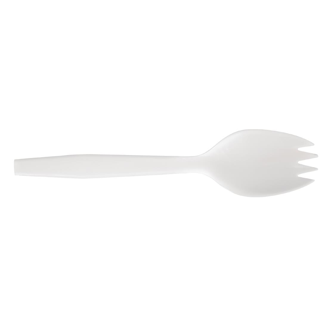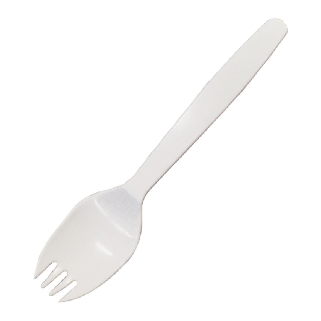 Make sure you’re fully equipped to deliver a superb food-to-go service with this pack of 100 x Fiesta plastic sporks. Combining the functionality of a fork and a spoon, these sporks allow your customers to easily eat everything from pasta salads to desserts without ever needing to change cutlery. The tough polystyrene material also gives the sporks enough strength to last through services without breaking, bending or snapping.Serving with the disposable sporks also makes clearing up easy, saving staff precious time for other duties. Are The Sporks Recyclable?Polystyrene can technically be recycled, but many facilities won’t accept these plastic sporks as the material is difficult to process. So you should always check with your waste management provider first before trying to recycle the sporks. Are The Sporks Food-Safe?Yes, these sporks meet the LFGB standard for food-contact materials. As such, there’s no risk of any substances leaching into your dishes and harming customers.What Types Of Food Can I Use With The Sporks?While they are made from tough polystyrene, these plastic sporks should only be used with lighter food types such as rice, pasta dishes and soft desserts.