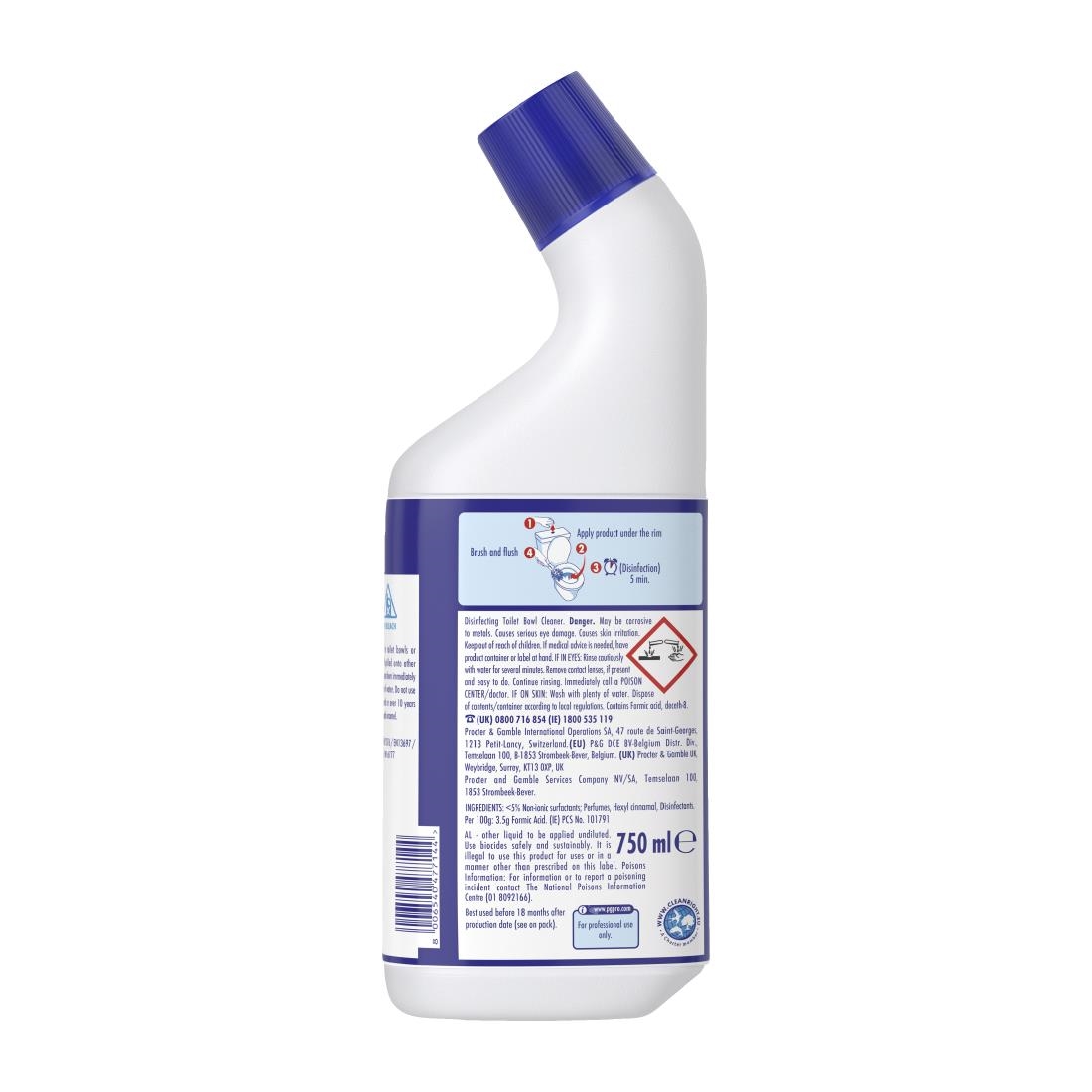 Designed for commercial use, Flash Professional disinfecting toilet bowl cleaner disinfects according to European guidelines: EN1276 & EN13697 (5 mins contact time).