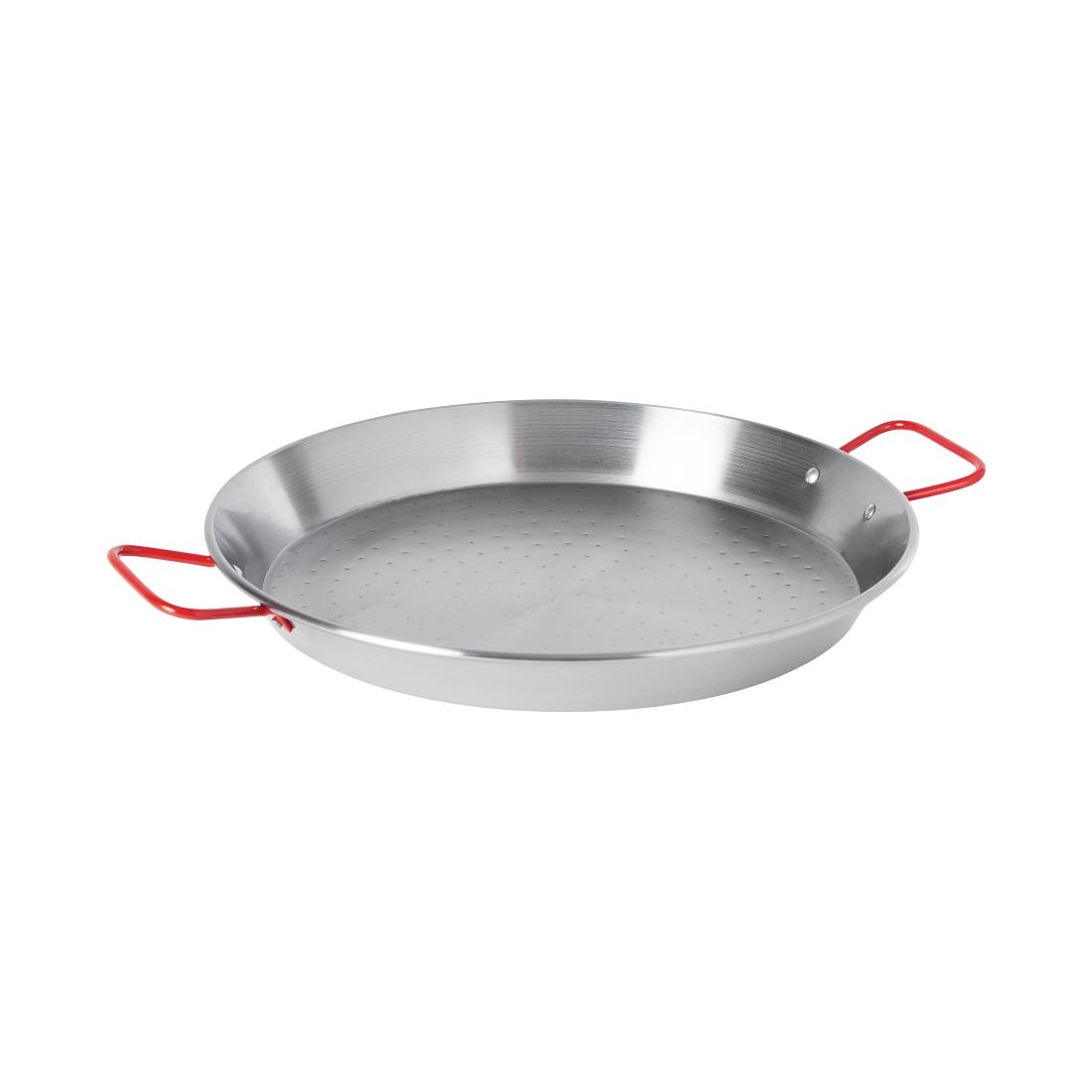 This 46cm paella pan from Garcima SL features a strong and traditional carbon steel construction. The carbon steel is used to give you that unique flavour that builds up after many uses. Not only does it make the pan strong enough to withstand constant use indoor and out, but it also helps you to create a flavour unique to your business. Two large red handles make the pan easy to lift and shake to stir.