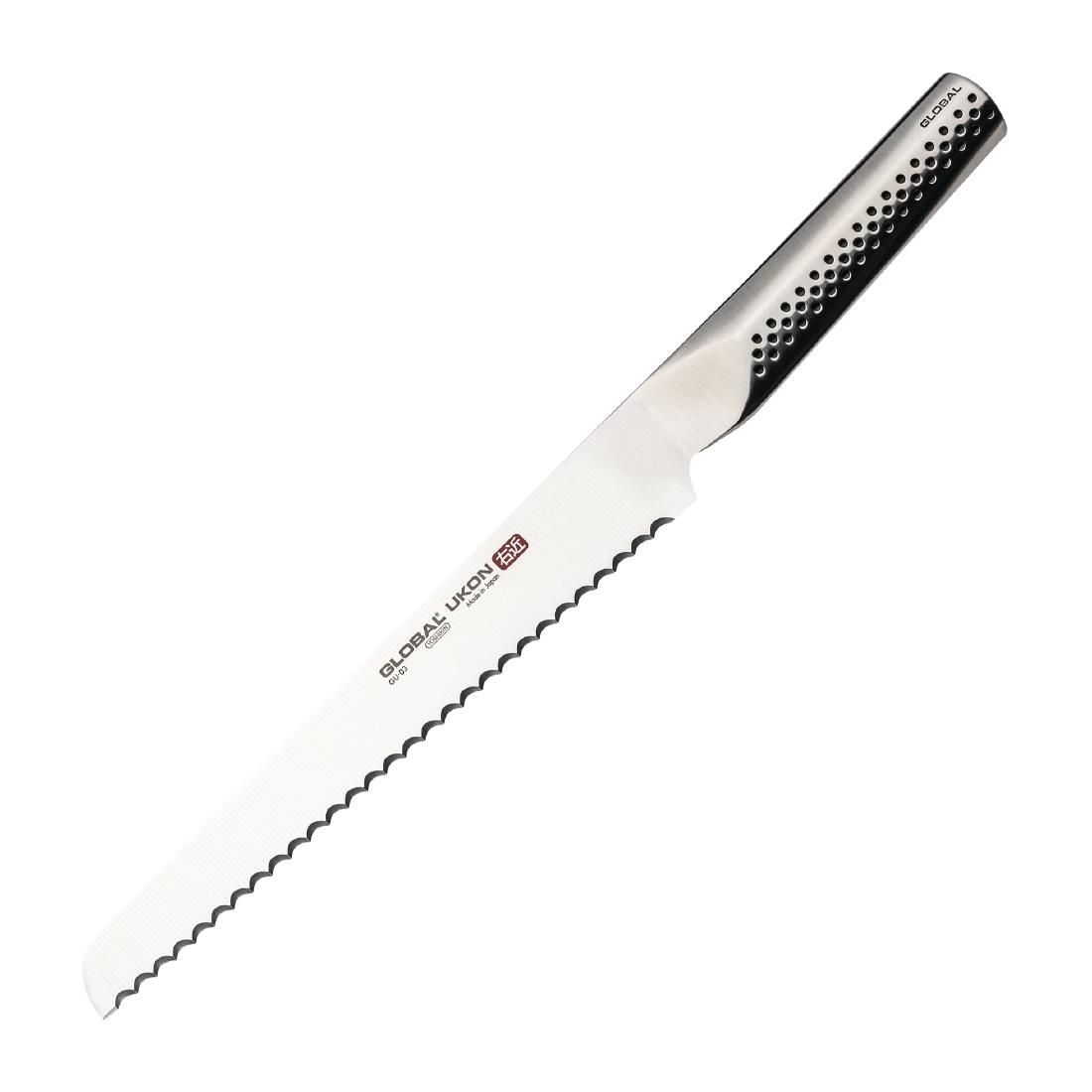 The name ¿UKON¿ has many positive connotations in Japanese legend, and in true GLOBAL tradition, the GLOBAL UKON series is constructed from the finest CROMOVA 18 Stainless Steel material and features thicker blades to enhance performance. The Global Ukon GU-03 Bread Knife has a long, serrated blade, perfect for slicing through thick crusty bread loaves and soft bread rolls. The GU-03 is also great for slicing soft fruit and vegetables such as tomatoes because the serrated blade glides into the delicate skin, preventing you from crushing the juicy inner layer, leaving a nice clean finish.