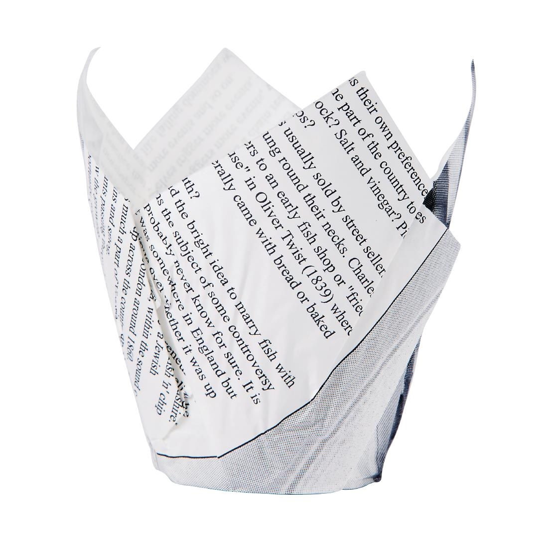 Add a fun touch to your food presentation with this pack of 1100 x grease-resistant paper chip crowns.The newspaper print design gives these chip crowns a retro look that perfectly complements the appearance of your fried treats. As they’re supplied ready-made, there’s also no time wasted when you need to serve your food, so you’ll always be able to keep up with demand during busy services.The crowns are strong enough to be used stand-alone, or to line frying baskets and stainless steel buckets – so you’ve got plenty of choice when it comes to serving your dishes.What Can I Serve In These Chip Crowns?The grease-resistant material means the chip crowns won’t absorb any excess oil or grease, making them perfect for serving chips, onion rings and other fried treats. These grease-resistant qualities will also help to keep your serving buckets and baskets clean and tidy.Are These Chip Crowns Oven-Safe?Yes, the crowns can be safely used in ovens at temperatures of up to 220°C for 20 minutes.Can I Recycle These Chip Crowns?As long as they’re free from heavy soiling, yes these newspaper chip crowns can be recycled after use. But if they’re covered in oil, food waste or sauces, they won’t be accepted as this soiling may contaminate the recycling process.