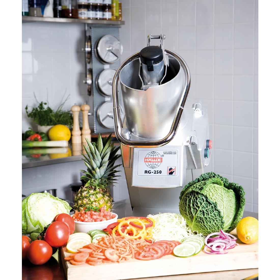 RG-250 takes vegetable preparation to a higher level ¿ with extreme high output and cutting performance, made to process 800 portions/day, 8kg/minute and has a duty cycle of 1.4 tonnes per day. The RG-250 can slice, dice, shred, grate, cut julienne, cut French fries and waffle vegetables, fruits, dry bread, cheese, nuts, mushrooms, etc. The machine has robust all-aluminium construction with an ergonomic user-friendly design. The machine has been designed for applications in restaurants, schools, hospitals, hotels, catering, canteens, QSR and supermarkets that demand the highest durability and cutting performance in larger scale.RG-250 has the ¿HALLDE Ergoloop¿ which enables the user to work with both hands. Large full moon shaped feed cylinder can take most items whole. The machine is easy to clean and embodies the highest safety standards. All cutting tools can be washed in a dishwasher. Direct drive with no intermediate connections for exceptional reliability. RG-250 has a wide range of cutting tools that can cut soft and hard products in every shape and size imaginable. A machine your business can grow with.