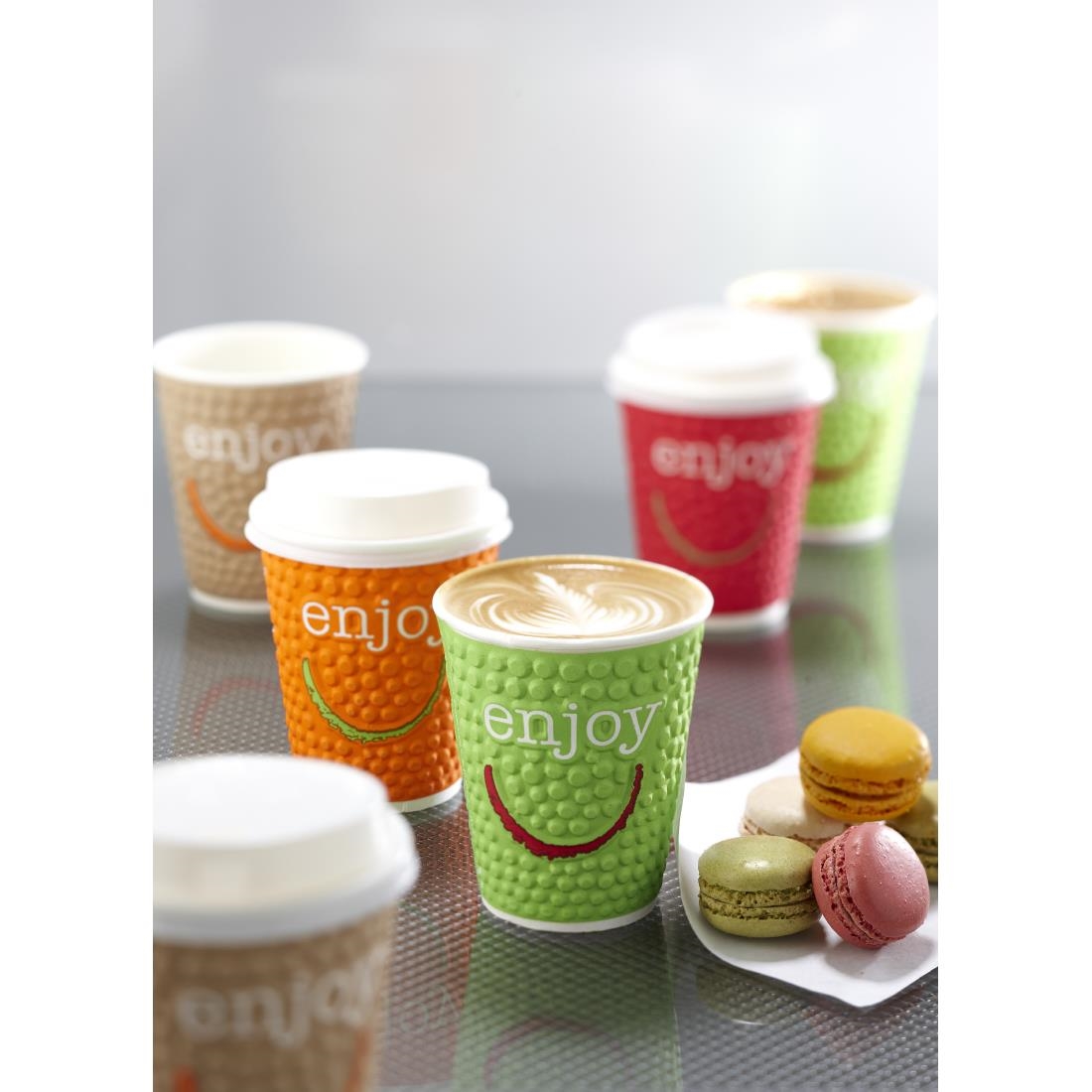 The funky “bubble” design on these cups does more than just make the cups look good. Creating a double wall, the textured pattern adds insulation so that sleeves don’t need to be used and creates a comfortable grip for your customers. The 16oz size is perfect for using as your “large” drink offering as this is the largest Enjoy hot cup available. These cups are supplied in sleeves of 560, with an equal amount of each colour – Hot Cerise, Zesty Orange, Nice ‘n’ Natural and Citrus Lime.