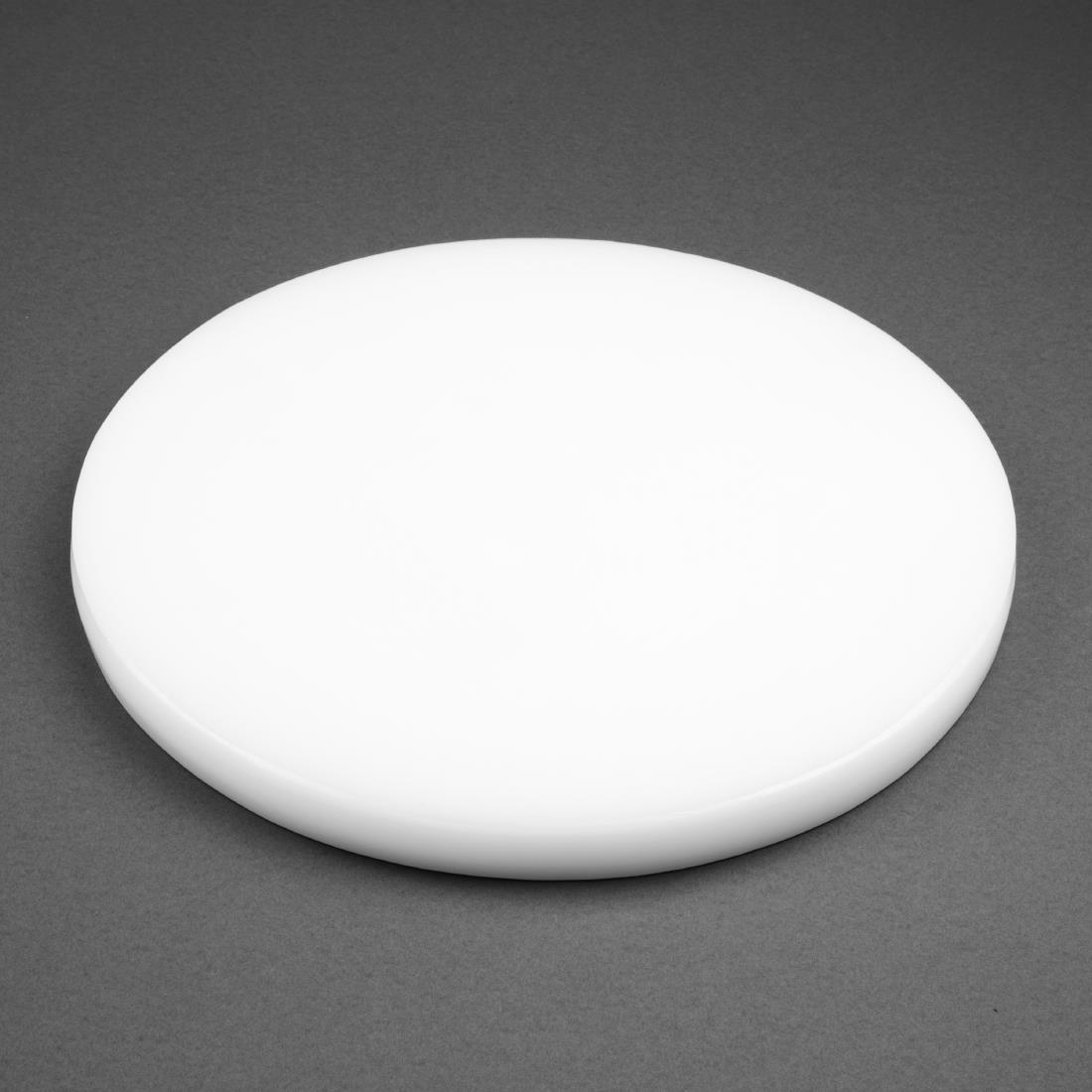 Safely and effectively prepare pastry and dairy products with the Hygiplas round white chopping board. Colour coded white to help kitchen staff quickly identify the correct equipment for each job, the board helps prevent cross contamination in your kitchen. Robust, reliable and resistant to cuts, the low-density polyethylene board is made to last, saving you money on replacements. Non-absorbent and easy-to-clean, the board helps you to hygienically prepare food. Affordable and dependable, it is ideal for both domestic and commercial use.