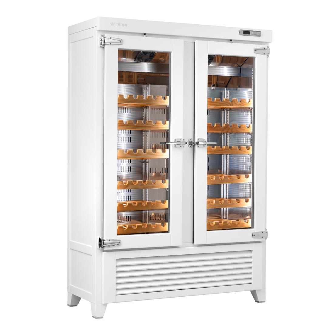 The Infrico EVV49R2G double door wine storage cabinet is a dependable solution for storing up to 180 bottles of wine in optimal conditions. With a wood exterior and stainless steel interior, the cabinet is both stylish and easy to clean. It has energy saving LED internal lighting and double glazed doors, both of which contribute to the energy efficiency of the cabinet.