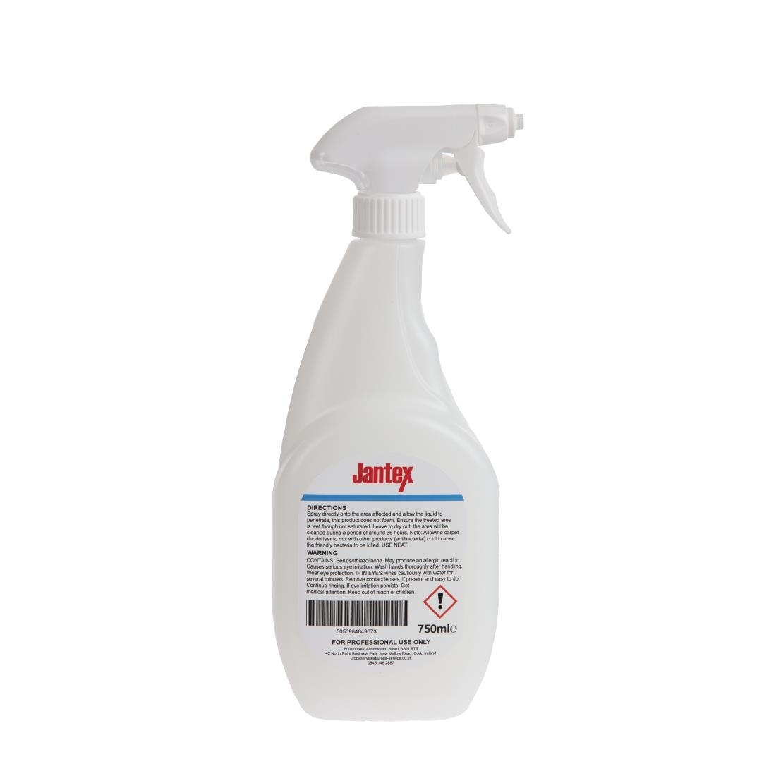 Can’t get rid of an unpleasant smell from your carpet? Try using this Jantex carpet deodoriser – it wastes no time in penetrating the surface of the carpet to find the source of the odour and eliminate it.The advanced formula can biodegrade urine into C02 and water, and remove any other unpleasant smells from your carpet or underlay. The cleaner is non-foaming, and couldn’t be easier to use – there’s no time wasted worrying about mixing or dilution, so you just need to aim, spray and leave it to dry. It really is that simple!