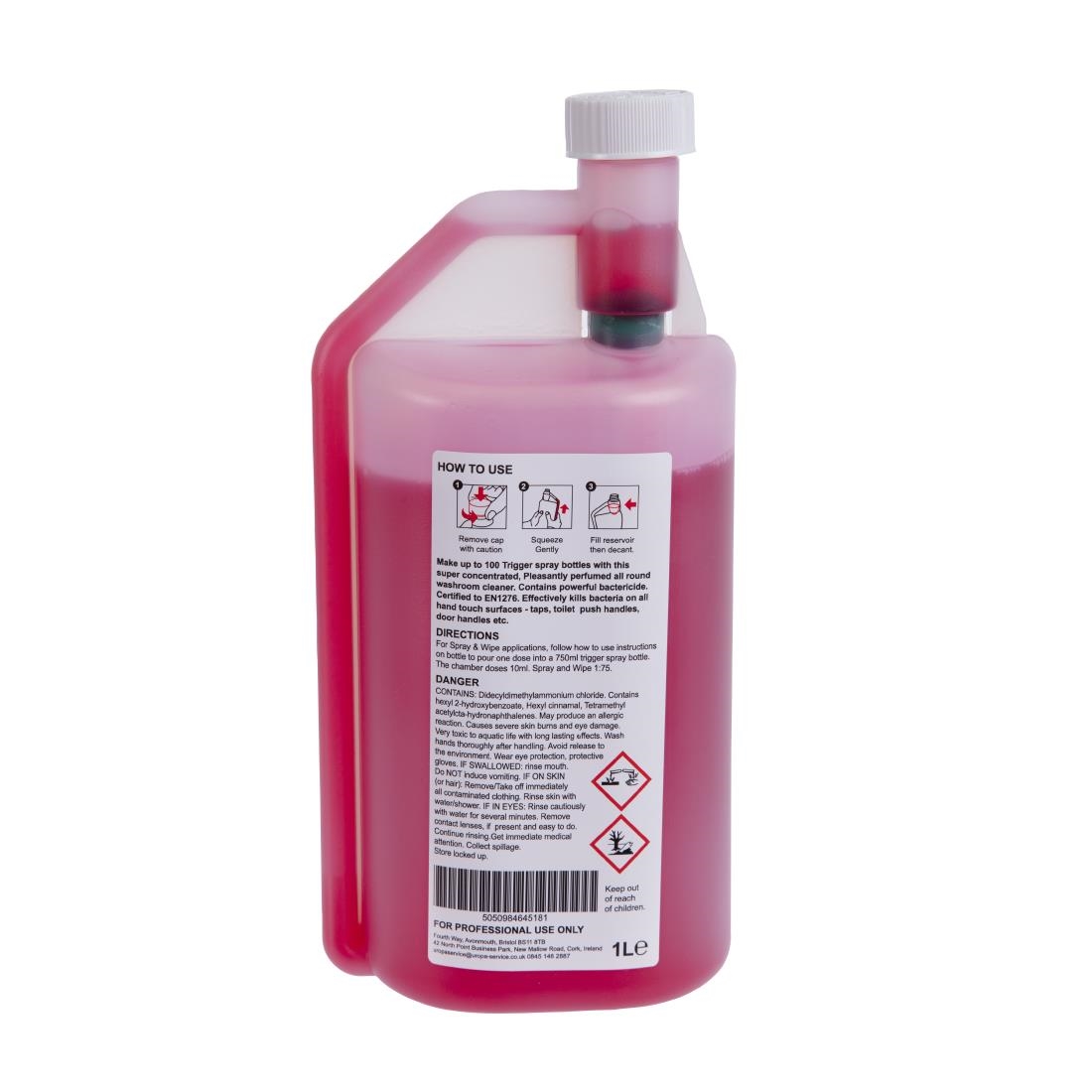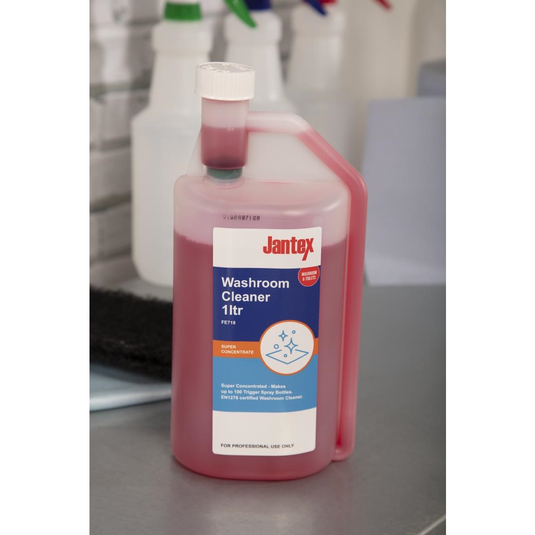 Stop the spread of bacteria in your bathrooms by using this super-concentrated washroom cleaner from Jantex. Certified to the BS EN 1276 standard, the solution contains a powerful bactericide that effectively kills bacteria on all touch points – keeping your taps, toilet flush handles, dispensers and door handles held to the highest hygiene standards.Part of the Super Concentrate range, this washroom cleaner delivers maximum performance from the smallest of doses – just 10ml is all you need to fill a 750ml trigger spray bottle, so you’ll get 100 refills from this 1Ltr bottle alone.The bottle also features a 10ml dosing reservoir which dispenses the perfect amount of solution every time. You won’t accidentally use too much chemical or over-dilute your solution, and you’ll ensure each bottle goes even further – fewer replacements, less plastic usage, and impeccable washroom hygiene!