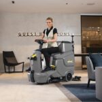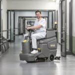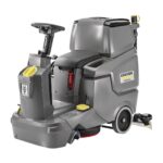 Leave large floors sparkling clean and dry in a single pass with the Karcher BD 50/70 ride-on scrubber dryer. Designed to be easy to use, the scrubber helps to speed up cleaning without compromising on performance. For power, the scrubber uses long-lasting 105 Ah batteries which are charged from a handy portable base station which be brought to the machine if a user is caught short.The large internal water and chemical tanks are easily drained/filled when required. It’s also compact enough to fit into small lifts – ideal for sites where multiple floors need work. Whether it’s being used in supermarket aisles, hospital wards or canteens, the Karcher delivers impressive cleaning results and removes the need for hand mopping and scrubbing.