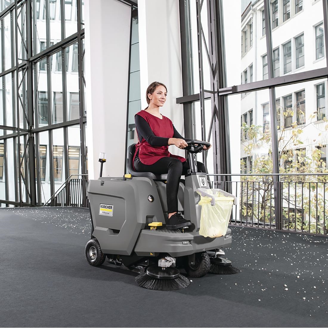 The Karcher KM 85/50 R Bp ride-on sweeper is a powerful, time-saving solution for cleaning large areas. Designed for performance and ease of use, the Karcher delivers impressive cleaning ability and functionality. The compact design and small turning circle allows the user to move the sweeper into confined areas, reducing the need for manual sweeping or mopping. Further convenience is added by the built-in battery powered motor ¿ as there’s no need for cables or wires to operate, the sweeper can move about freely without creating any trip hazards. Maintenance is easy too, with most components able to be changed by the user without specialist training.