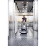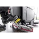 Thanks to its compact design, it impresses with its clear arrangement and thanks to the integrated traction drive as well as the comfortable four-wheel system also with simple, effortless manoeuvrability. The 850 mm long squeegee and the disc brush head with 27 kilogram brush contact pressure are made from high-quality, robust and long-lasting aluminium and ensure excellent cleaning results. A standard external battery charger allows the powerful and maintenance-free AGM battery with 115 Ah capacity to be charged in everyday working life for long applications.