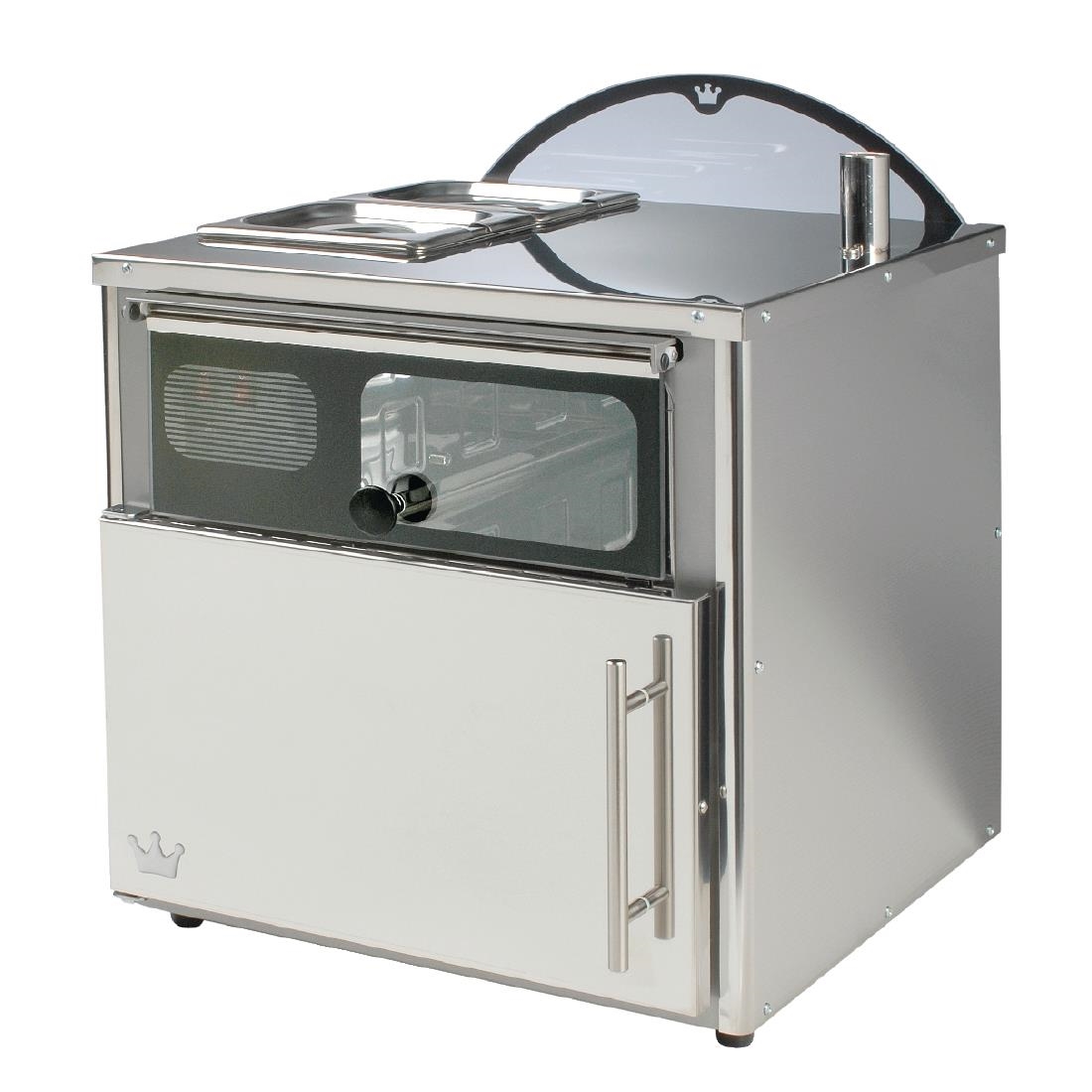 The King Edward Compact Potato Baker COMPSS features a fan assisted convection oven with independently heated built-in wet or dry heat bain marie top, removable pans for hot toppings and a table top preparation area. The baker is illuminated, displaying the cooked potatoes, and also features a customer-facing wipe-clean toughened glass menu board for displaying any specials and comes with removable oven shelves. There is no need for any additional or specialist ventilation or exhaust canopy.