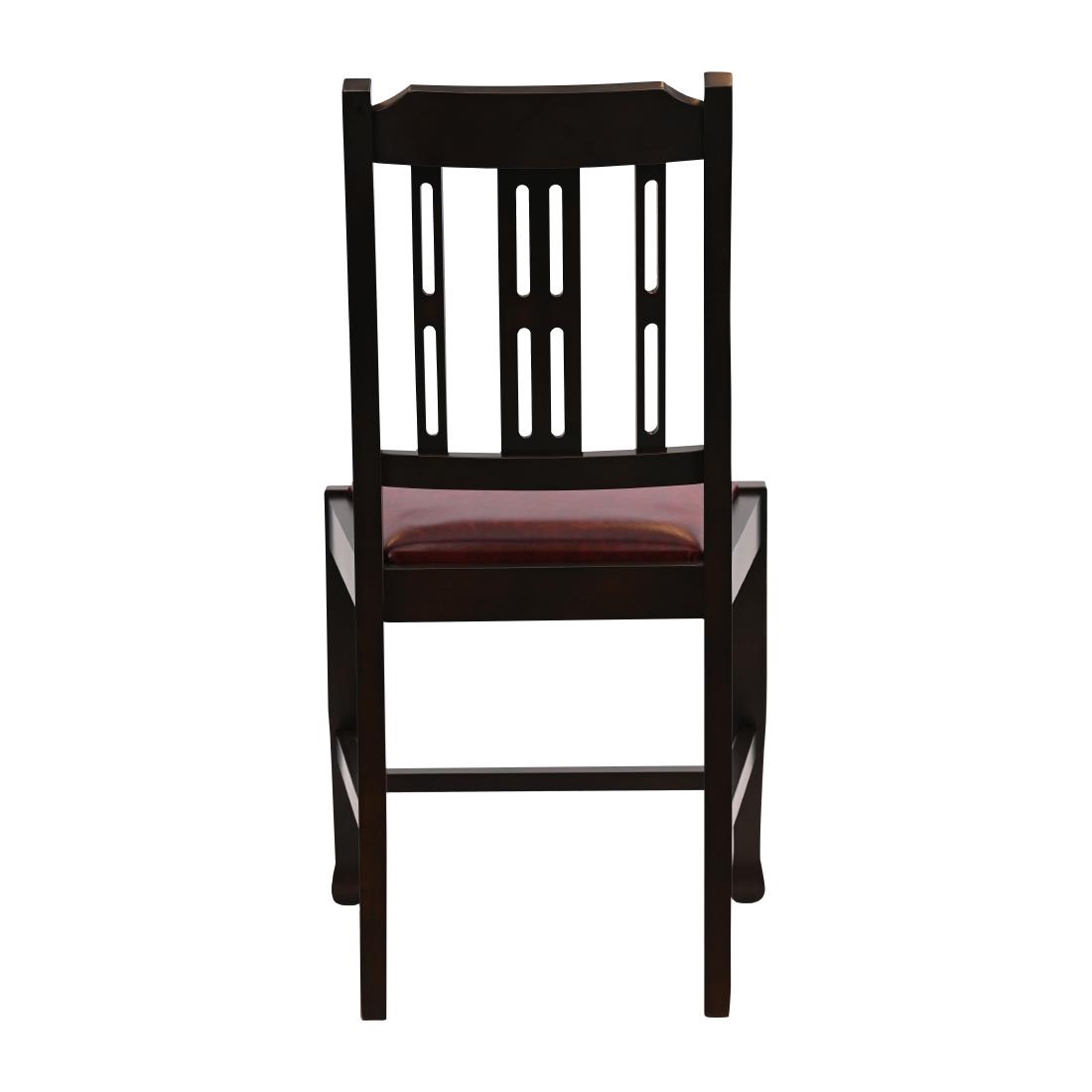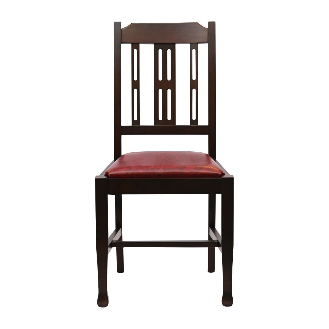 Made from rubberwood in a dark walnut finish, these contract-quality dining chairs come fitted with seat pads upholstered in easy-to-clean Bison Bordeaux red vinyl. Each chair conforms to CRIB 5 FR standards, ensuring suitability for hospitality use.